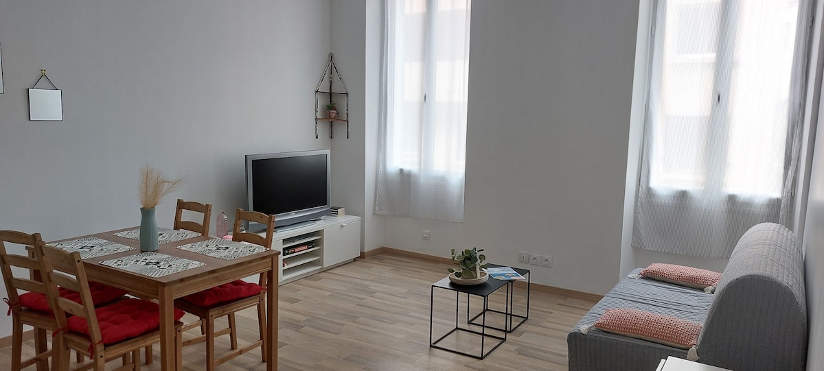 Suíomh iontach, lár na cathrach i gceantar bríomhar an tseanphort, árasán i bhfoirgneamh 43m2 Pouillon le balcóin ar an gcalafort. 4ú hurlár. Digicode. Ardaitheoir. In aice le gach saoráid agus bialann. Tointeálaithe bus, fobhealach agus farraige ag bun an fhoirgnimh. Páirceáil ar tháille ag 50 m. Maireachtáil/cistin lánfheistithe le meaisín caife nespresso, seomra folctha ina bhfuil cithfholcadán siúil isteach, seomra leapa ar leith ina bhfuil leaba 160 x 200. Lug stóráil 50 m.