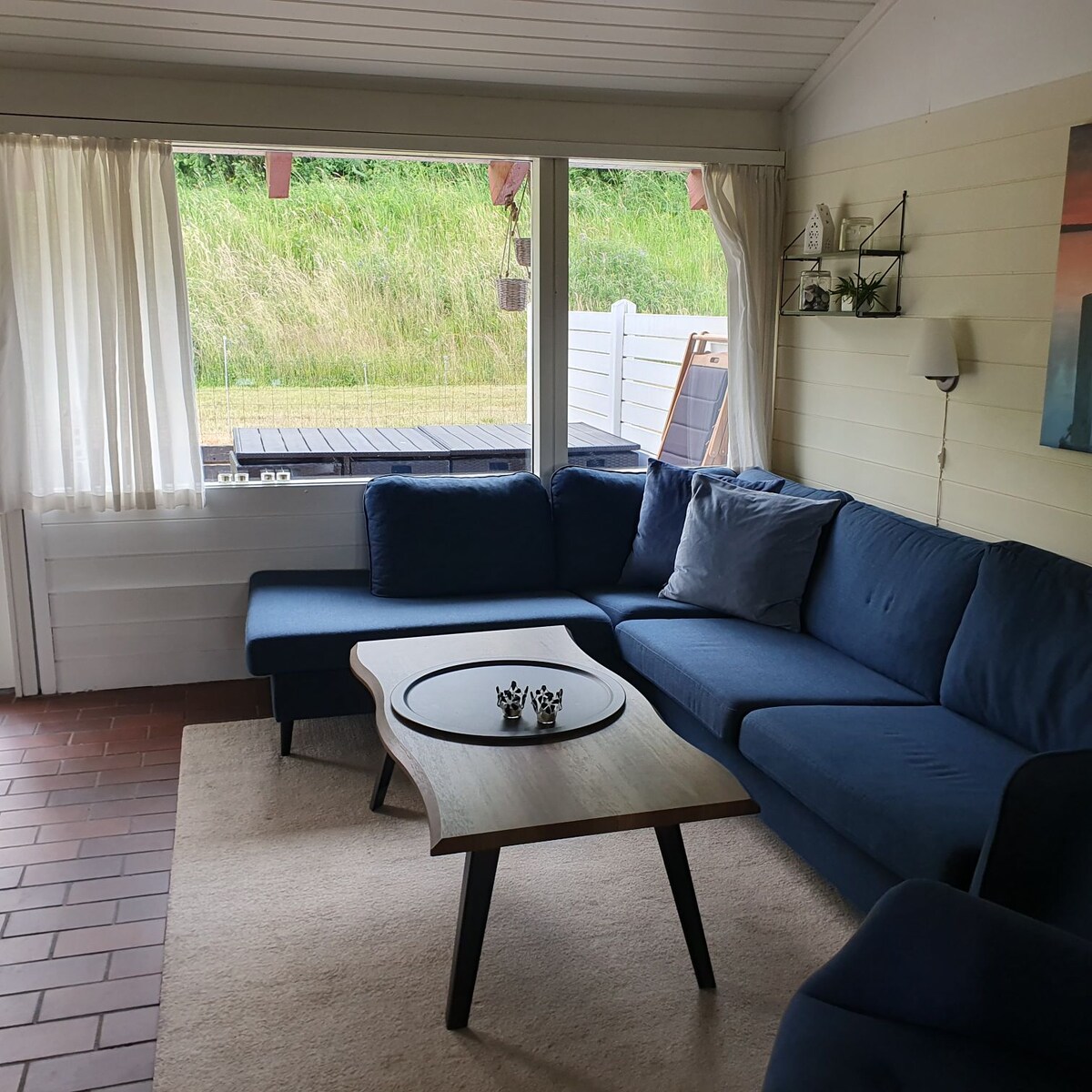 Cábán de 42 m2 atá suite ar phlota mór le radhairc dhíreacha agus gan cur isteach ar Hopsø. Tá Hopsø cosanta agus tá saol saibhir éan ann. Ón gcábán tá rochtain ar roinnt bóithre ar bhá agus ar thrá Genner - achar 200 méadar. Tá solas álainn sa teachín agus is áit fhoirfe “saoire ghearr” é do bheirt. Tá éadaí leapa ar fáil sa seomra suí ar leaba thoilg ar feadh 2 cheann eile. Níl ach cuirtín amháin ann don seomra leapa - gan doras ar bith.