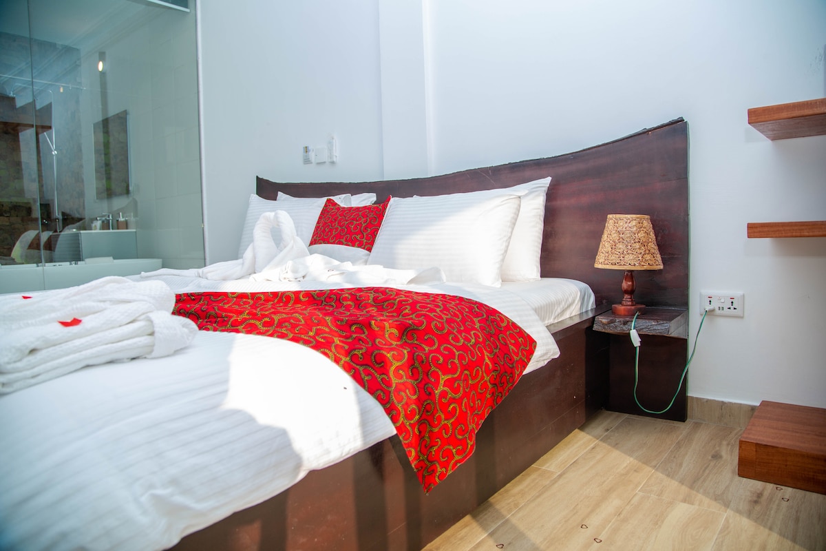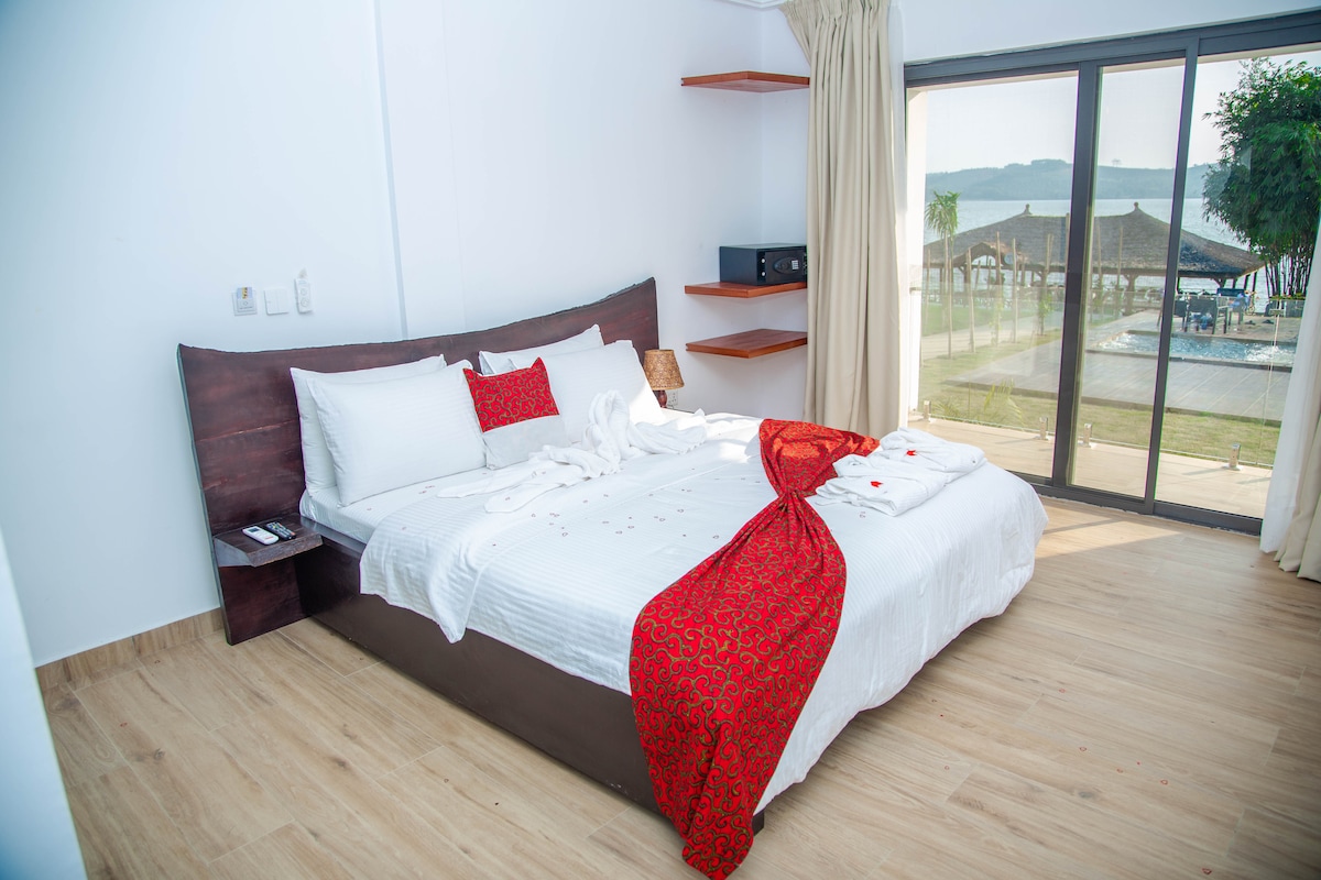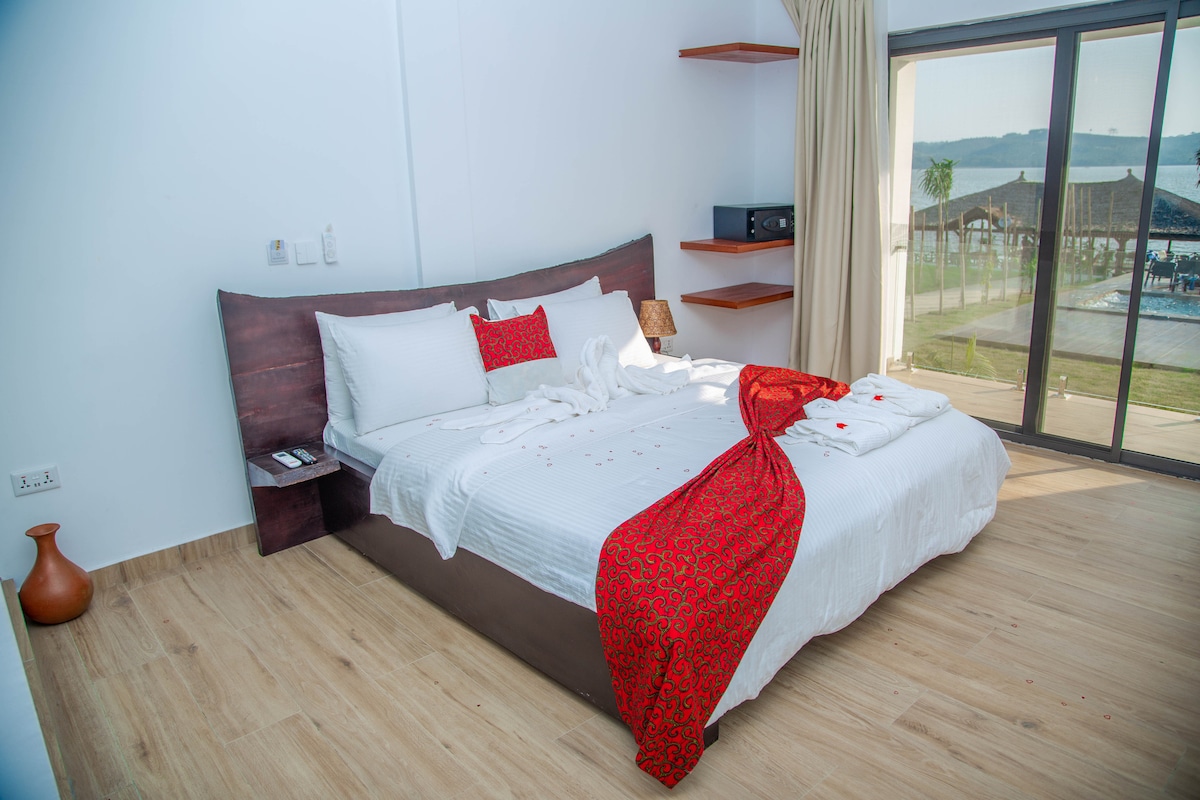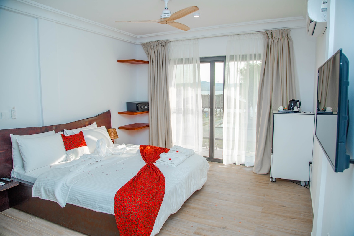 Chambre élégante et lumineuse, alliant design naturel et confort haut de gamme : literie premium, salle de bain privée, TV, climatisation, vue sur la piscine et Wi-Fi gratuit.