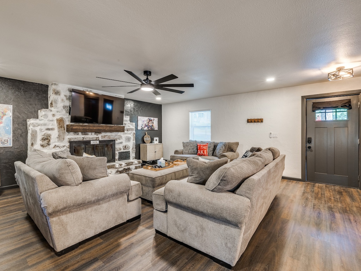Fáilte chuig Heartland Haven! Le 11 leaba agus 3 sheomra folctha iomlána tá go leor spáis ann do gach duine. Is é siamsaíocht lasmuigh an téama ag Heartland Haven le TOBÁN TE, cúirt chispheile, cistin lasmuigh, poll dóiteáin & radhairc locha! Mura bhfuil an aimsir ag comhoibriú, ná bí buartha, tá paitió cúil clúdaithe againn a ligeann duit taitneamh a bhaint as an saol amuigh faoin aer beag beann ar an aimsir. Tá cluiche stuara, cluichí boird, foosball, teilifíseáin chliste agus neart lóistín cluthar againn taobh istigh freisin!