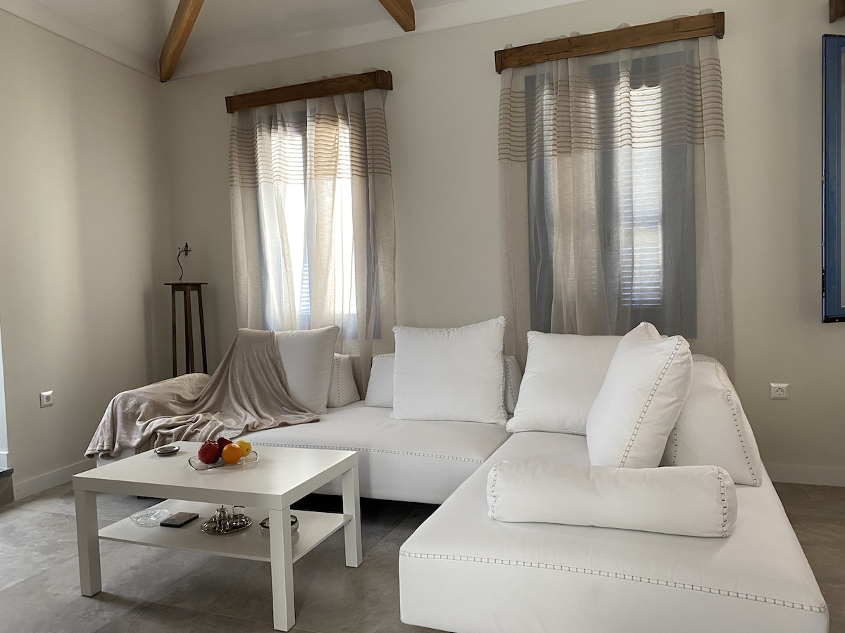 Tá an teach fairsing seo, lena radharc iontach ar an bhfarraige, suite i lár Chalkida. Lig do scíth san árasán álainn lán - athchóirithe seo, atá maisithe go blasta i ndathanna an ghainimh agus na farraige. Freastalaíonn sé ar 6 dhuine i 3 sheomra leapa agus 2 sheomra folctha ina bhfuil seomra suí ollmhór agus cistin nua - aimseartha. Céimeanna ar shiúl, is féidir leat snámh san fharraige nó dul ag spaisteoireacht go fóill ar feadh an phromanáid lena bialanna agus caiféanna iontacha. Bain sult as d'fhanacht sa tseoid chompordach seo cois farraige!