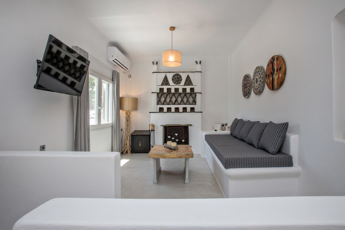 Bain sult as radhairc mhara Aeigéacha ó Deluxe Suite stylish i Mykonos Town (" Legends in Town "). Deartha ag ailtire a bhfuil duaiseanna buaite aige. Bíodh súimín fíona agat ag ardán Príobháideach le jacuzzi le linn luí na gréine. Lig do scíth ar leaba an Rí le tocht ardchaighdeáin. Déan iniúchadh ar bhialanna agus ar bhúitíceanna bhaile Mykonos laistigh de shiúlóid ghearr Buaicphointí: * Radhairc Fhaiseanta ar an bhFarraige * Jacuzzi ar an Ardán * Leaba Rí, Tocht Ardchaighdeáin * Lárnach ach Ciúin * Luí gréine álainn