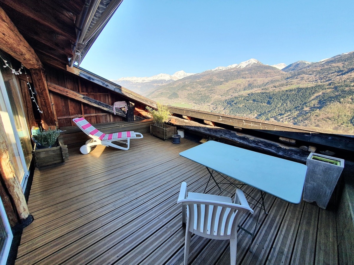 Árasán mór geal feidhmiúil de 92 m2. Halla isteach le clóiséid, 3 sheomra leapa , seomra folctha, seomra suí mór soiléir agus dea - fheistithe ag breathnú amach ar ardán príobháideach nach bhfuil dearmad déanta air (feistithe sa samhradh le faiche, seomra suí). Chomh maith le 6 dhuine, glacaimid le leaba shingil, scáthleaba (slándáil) a chur leis. Páirceáil saor in aisce ar an gcósta. 3.9 km ó Aime, gar do na hionaid saoire Plagne le haghaidh sciála ( thart ar 20 nóiméad sa charr), ar an Versants du Soleil le haghaidh fánaíochta nó snowshoeing.