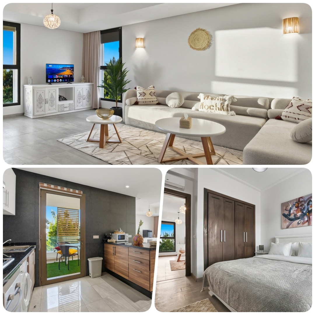 Vue Océan, Piscine & Sérénité | Taghazout Évadez-vous dans notre appartement avec vue plongeante sur l'Atlantique, à 2 km des spots de surf. Entre forêt d'arganiers et océan, profitez d'un calme absolu dans une résidence sécurisée 24h/24. Vos avantages : • Lit Queen Size Premium • Piscine & Parking gratuit • Balcon privé vue mer • Proximité immédiate des meilleurs spots de surf • Arrivée autonome Logement climatisé, et chauffé Idéal pour couples ou surfeurs. Voiture fortement conseillée
