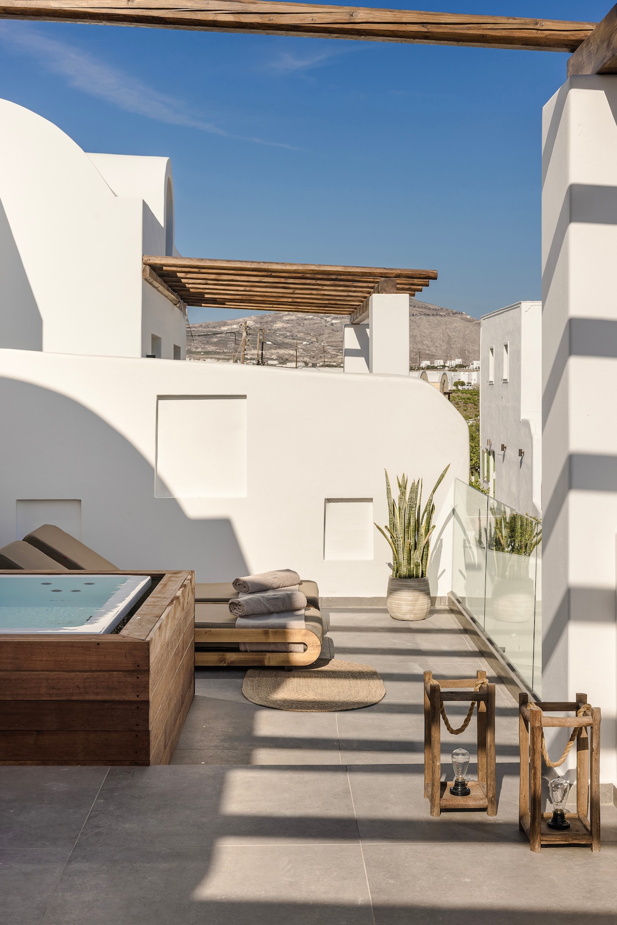 Villa Calderini atá suite in Imerovigli, cuireann sé beagnach 360 radharc ar an oileán ar fáil, ón mbolcán agus ón gcaldera go dtí an Santorini. uaidh ardán príobháideach le tobán te. Feistithe le cistin iomlán, seomra leapa sómasach agus seomra suí leis na háiseanna go léir chun fanacht dodhearmadta a chur ar fáil d'aíonna