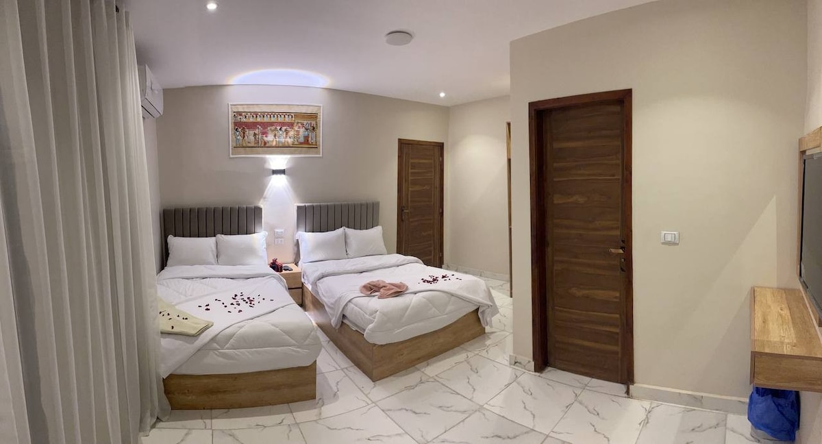 Bain sult as bricfeasta iontach lenár radharc iontach ar na trí phirimidí agus ar an sphinx. Tá an seomra suite ar ár 3ú hurlár agus tá sé ar cheann de sheomraí nua - athchóirithe. Bainfidh aíonna taitneamh as fanacht i seomra le téama na hÉigipte ina bhfuil 2 Leaba Dhúbailte agus Pirimidí View! Tá stáisiún caife/tae ann le huisce dea - mhéine. Is gnó ar siúl teaghlaigh é seo, agus nuair a bhíonn tú anseo, is teaghlach thú. Rud ar bith a theastaíonn uait, inis dúinn. Tá a seomra folctha príobháideach i ngach seomra