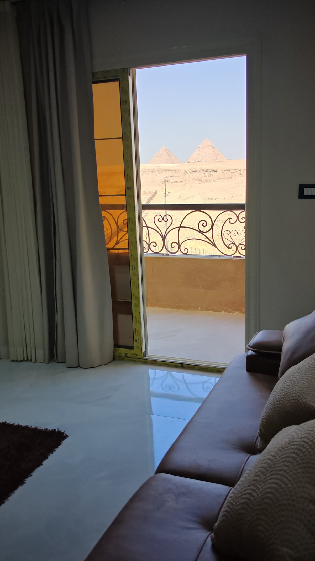 Fáilte chuig ár n - árasán urlár barr nua - aimseartha. Le radhairc iontacha ar na Pirimidí Móra, ar Mhúsaem na hÉigipte agus go leor eile. Tá áit chompordach ann do 5 dhuine inár dteach aerchóirithe. Tá sorn, oigheann, micreathonnán agus friochtán aeir sa chistin nua - aimseartha. Fan ceangailte le Wi - Fi ardluais agus taitneamh a bhaint as siamsaíocht ar ár teilifís chliste cothromscáileáin. Taithí só i gcroílár na hÉigipte. Slándáil Fhoirgnimh 24/7. Garáiste Páirceála faoin bhFoirgneamh.