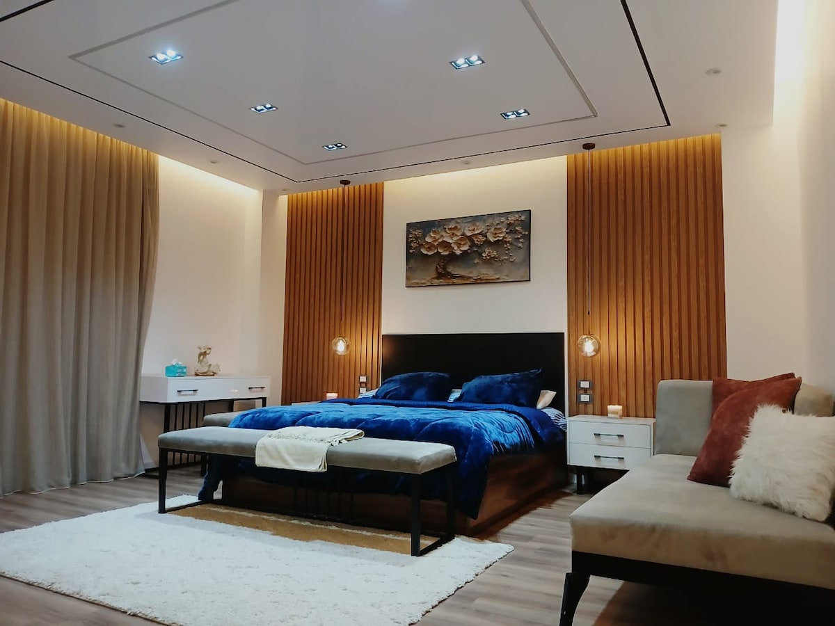 Escape to Oberoi's 9th District! Luxurious 3BR apt overlooking green spaces & main thoroughfare. Hotel-style furnishings, modern amenities. - 1 master bedroom w/ glass bathroom & dressing - 2 king-size bedrooms - 1.5 bathrooms - Full kitchen - 2 smart TVs Near Golf City Mall (10min), Cairo Airport (25min), Egyptian Museum (52min). Airport pickup/drop-off available (fee applies). Hair styling & makeup services also available (fee applies).
