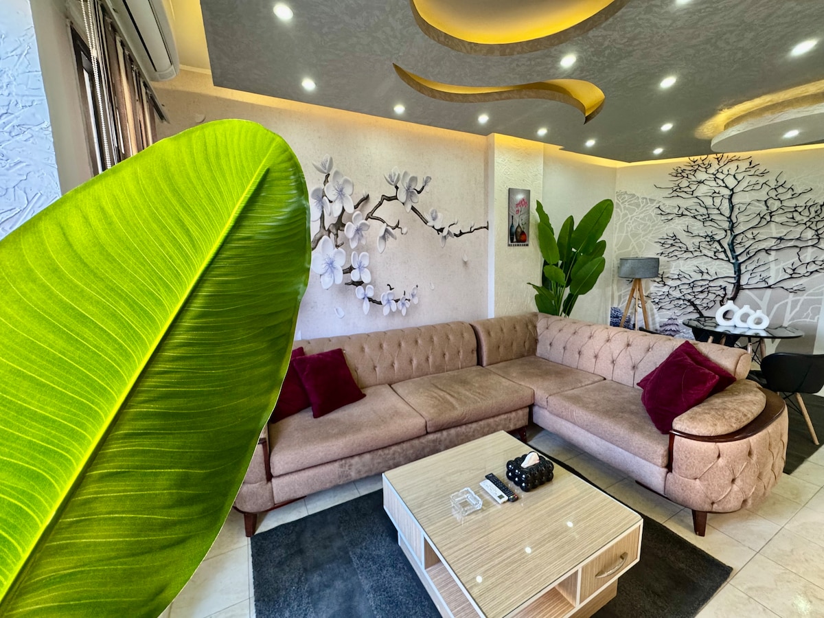 Fáilte chuig do shaoire fhoirfe! Tá 2 sheomra leapa agus áit fáiltithe chic san árasán galánta seo, rud a fhágann go bhfuil sé oiriúnach do theaghlaigh nó do ghrúpaí cairde. Fan fionnuar compordach le haerchóiriú,foirfe do na laethanta te samhraidh sin. Mar gheall ar an maisiúchán faiseanta agus an vibe teolaí braitheann sé díreach cosúil leis an mbaile. Lig do scíth le radharc iontach gairdín a leánn strus an lae. Cuir tús le do mhaidin inár mbalcóin theolaí. **Príomhshuíomh: Go díreach os comhair an mhargaidh thoir agus An Chúirt Bia ** *15 nóiméad ón Aerfort*