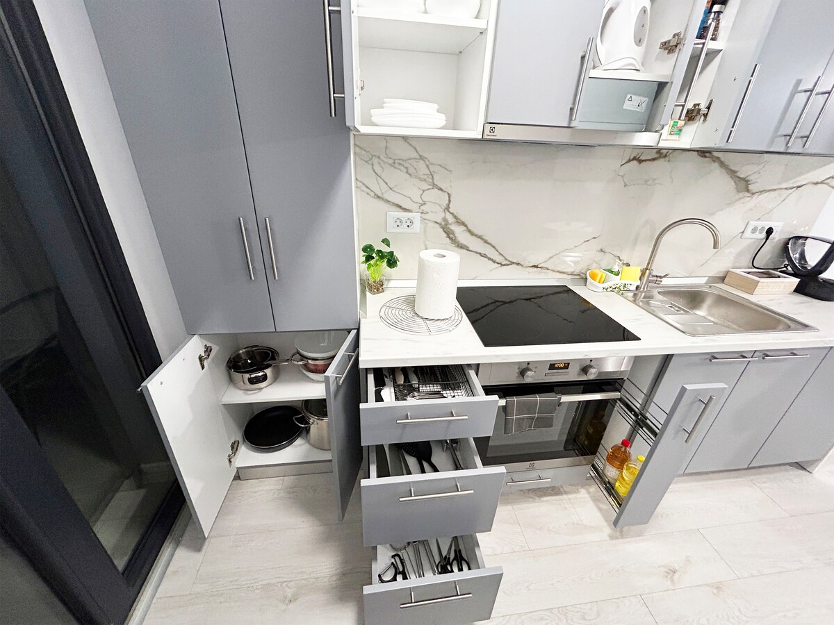 Tá an t - árasán suite ar urlár na talún i siopa ceithre urlár, tá sé lán de 2 sheomra, feistithe le teilifíseán réscáileáin, cistin Wi - Fi saor in aisce, dea - fheistithe le miasniteoir, sceanra, gréithe, déantóir caife, tóstaer, citeal, cuisneoir, agus seomra folctha le folcadán, le triomadóir gruaige, tuáillí agus earraí níocháin saor in aisce. Tá an t - árasán feistithe le meaisín níocháin le triomadóir, iarann agus clár iarnála. Cuirtear áiseanna caife agus tae saor in aisce ar fáil!