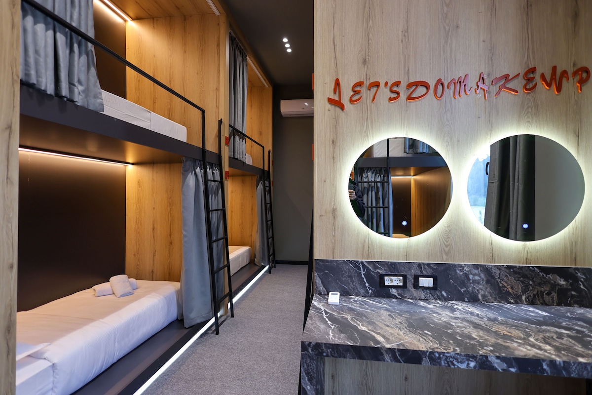 Leaba shingil i suanlios 6 leaba. Tá seomra folctha ensuite nua - aimseartha, AC, agus taisceadáin mhóra ag an suanlios. Tá a asraonta féin ag gach leaba chun fóin a ghearradh nó cibé rud a theastaíonn uait. Tá cistin chomhroinnte agus limistéar gairdín comhroinnte ann a bhfuil fáilte romhat é a úsáid chomh maith! Táimid suite ar shiúlóid 3 nóiméad ar shiúl ón stáisiún bus go Tirana agus níos faide i gcéin. Níl ach siúlóid 5 nóiméad go dtí an tsiamsaíocht oíche ag an Pedonale.