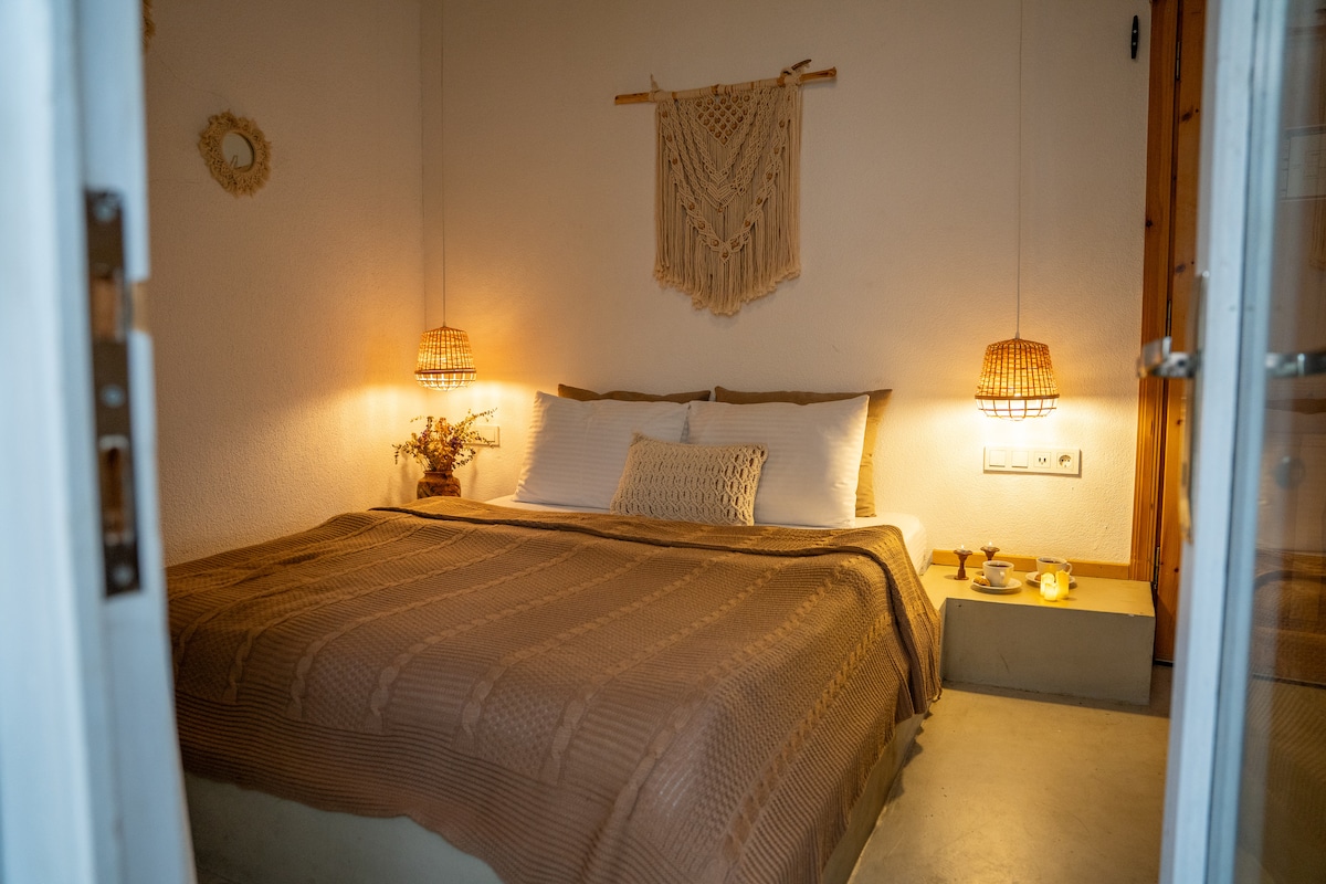 Seomra dúbailte le bealach isteach ciúin féinchuimsitheach agus seomra folctha ar na sráideanna is áille a théann síos go lár Cunda le rochtain ar an ngairdín.