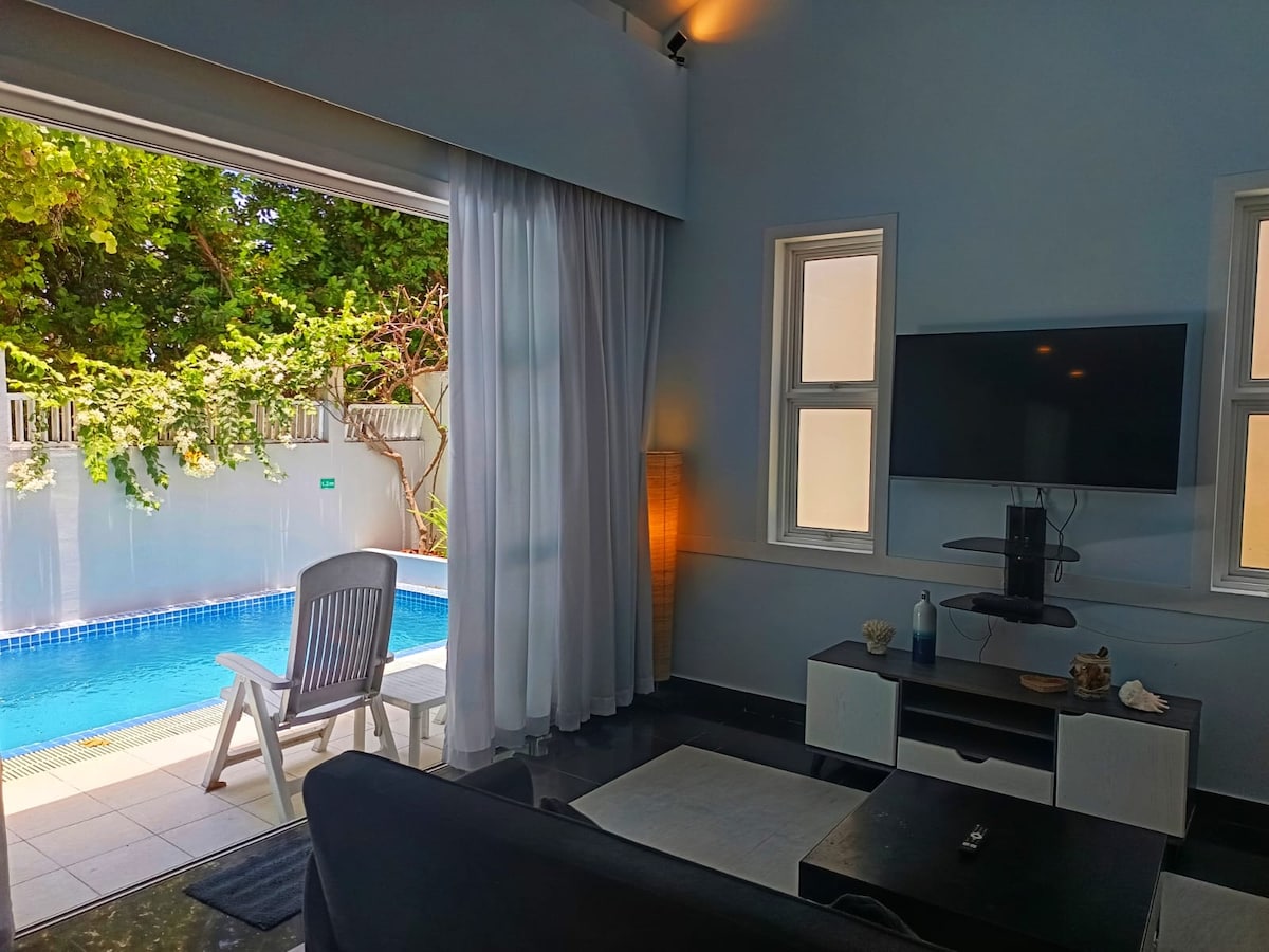 Rihiveli home is a 4 bedroom bungalow with a living room, kitchen and a plunge pool. Each bedroom has an en-suite bathroom and serviced daily with linen and bathroom amenities. The bungalow is located on beach front, just a minute away from the white sandy long beach and watch the sunset. Nearby are cafe's and restaurants.