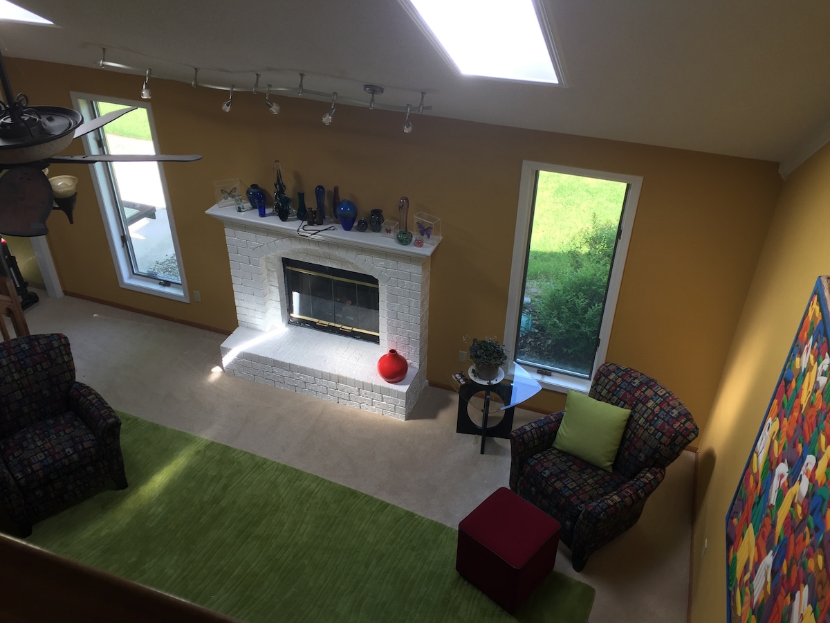 Bain sult as teach atá fairsing, ach atá teolaí. Thart ar 10 -15 nóiméad ó lár Fort Wayne . Is suíomh foirfe é an teach seo chun rochtain a fháil ar gach rud atá le tairiscint ag Fort Wayne ach tá sé sách cúlráideach chun scíth phríobháideach a fháil! Tá clós fálaithe againn, atá feistithe le poll dóiteáin agus paitió. Bain sult as suí taobh amuigh le haghaidh caife ar maidin nó beárbaiciú tráthnóna le cairde/teaghlach. Taobh thiar den teach tá cosán siúil agus clós súgartha a bhfuil cead ag páistí taitneamh a bhaint as!