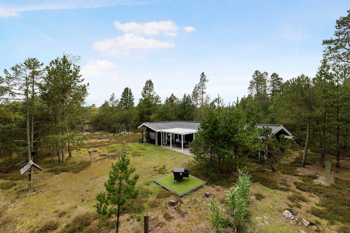 Teach nua-aimseartha deas teaghlaigh sa choill - 109 m2 + 45 m2 aguisín, jacuzzi lasmuigh, folcadh buailte agus sauna. Tá locháin timpeall an tí, cúirt eitpheile trá agus áit tine. Tá sé achar gairid go dtí an fharraige agus 10 nóiméad go dtí tránna áille in Øster Hurup agus 5 nóiméad go dtí siopadóireacht. Tá spás sa teach do 8-10 duine. Tá an teach feistithe le leathanbhanda snáithín agus wifi a chlúdaíonn an talamh nádúrtha 3000m2 ar fad. I mí Iúil agus mí Lúnasa, déantar seiceáil isteach ar an Satharn. D'fhéadfadh go mbeadh go leor feithidí ann uaireanta.