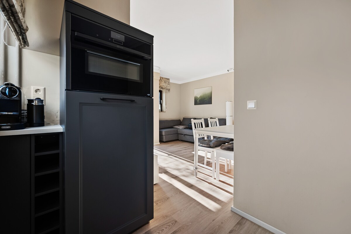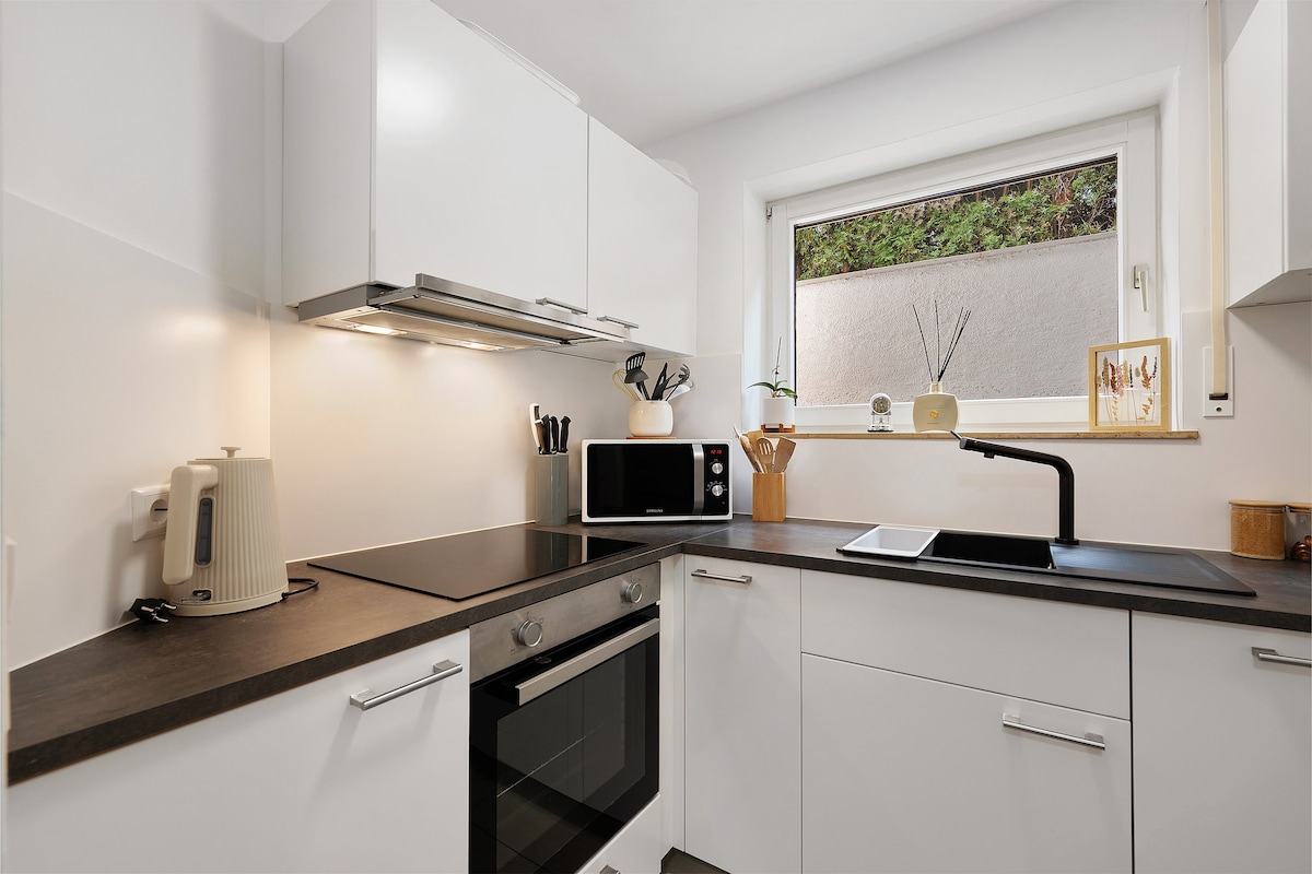 Cuireann ár n - árasán 48 m² ina luí ar a shuíomh ciúin le rochtain dhíreach ar an ngairdín agus ar an ardán fairsing. Le seomraí atá feistithe go grámhar agus cistin atá feistithe go hiomlán, cuireann sé gach rud ar fáil le haghaidh fanacht compordach. Foirfe do lánúineacha, do theaghlaigh bheaga nó do thaistealaithe gnó – níl sé ach cúpla nóiméad ar shiúl ó bhialanna agus ó iompar poiblí.