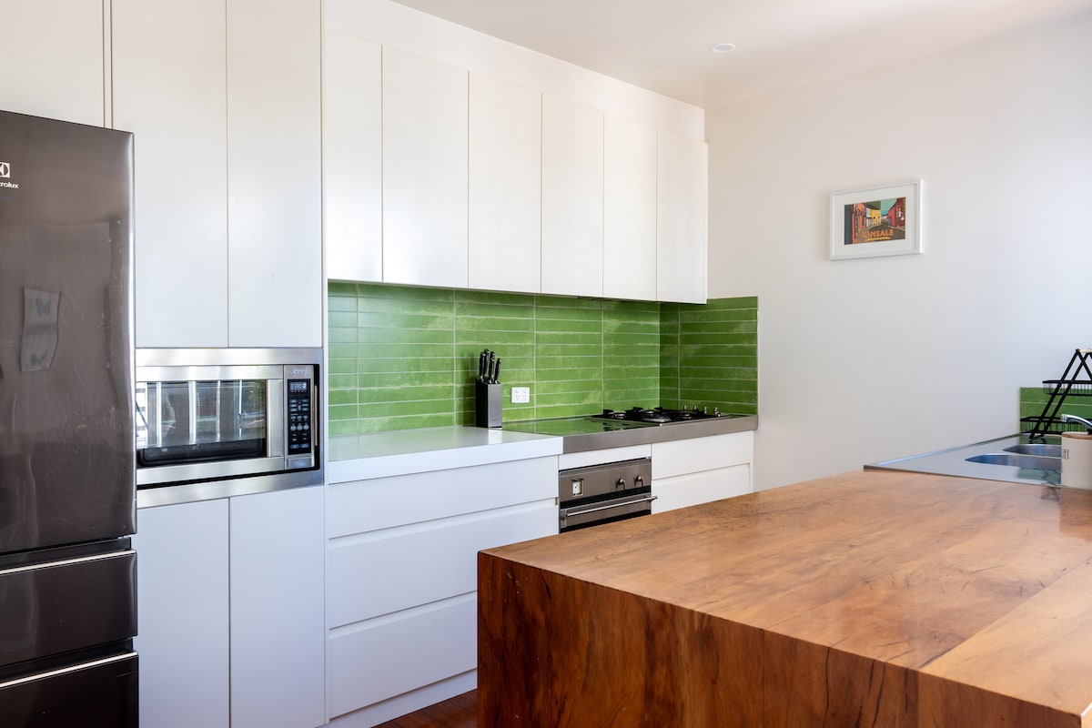 Is éard atá i gceist leis an teachín oibrithe 100 bliain d'aois seo ná taobh istigh saincheaptha. Tá na ballaí agus na seilfeanna lán le saothar ealaíne taibhseach, tá píosaí seanré foinsithe go speisialta sa teach scaipthe i ngach áit, tá na leapacha líonta le línéadach tí sómasach agus tá tolg 3 shuíochán sa tolglann b'fhéidir nár mhaith leat riamh éirí as. Lonnaithe go lárnach, trasna an bhóthair ó Mhargaí Melbourne Theas, achar siúil go dtí Albert Park Lake agus turas tapa tram go dtí an CBD. Tabhair faoi deara - gan teilifís, mar sin tabhair leat feistí más gá.