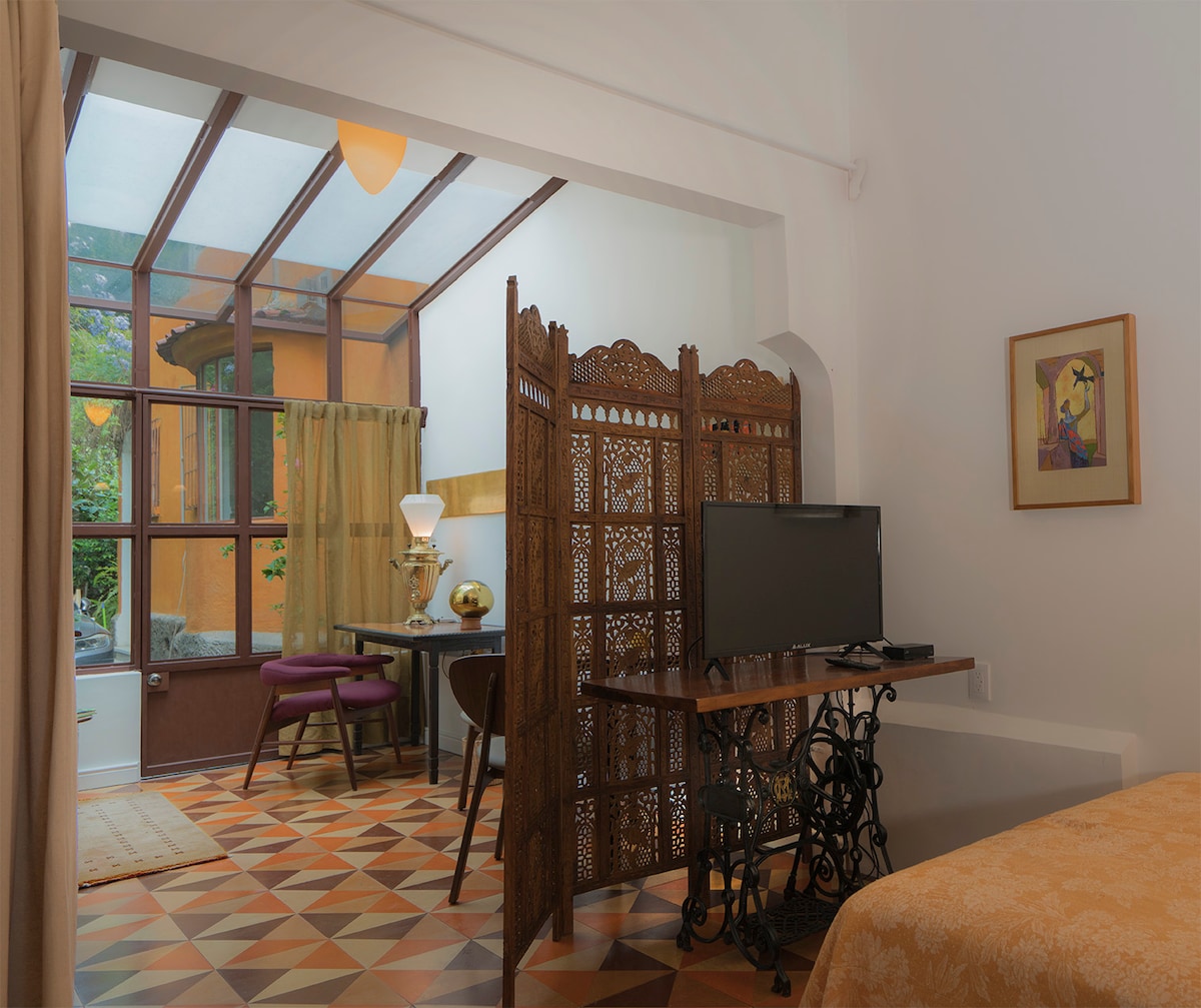 Tá paitió príobháideach timpeallaithe ag plandaí agus glaise sa spás gleoite ildaite seo, atá oiriúnach do thaistealaithe aonair nó do lánúineacha. Tá leaba lánmhéide, áit shuíocháin theolaí, deasc, cistin, teilifíseán agus Wi - Fi tapa ann. Bain sult as solas nádúrtha, dearadh tuisceanach, agus bríomhar síochánta. Lonnaithe in Escandón, comharsanacht chiúin bharántúil le rochtain éasca ar Condesa, Roma, agus caiféanna áitiúla, tá sé go hiontach le haghaidh cianobair nó saoire chultúrtha.