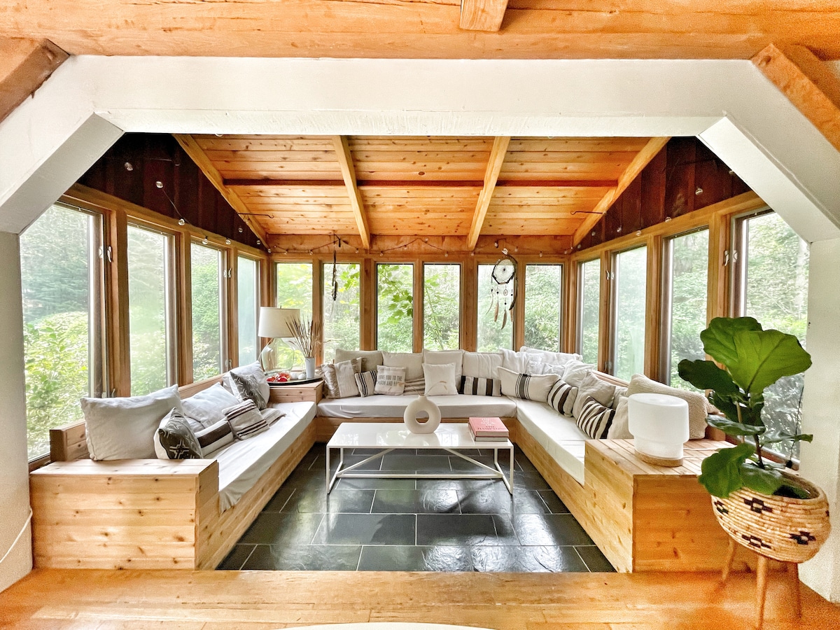 Cliceáil trí thaifid faoi shíleálacha ardaitheacha agus croch amach iad sa tobán te ar feadh na bliana ag an tearmann plean oscailte seo in East Hampton. Lig do scíth sa chlós cúil coillte, léim isteach sa linn snámha nó sa spá, déan díthocsainiú sa sabhna, grioll ar an mbeárbaiciú, lig do scíth sna suíocháin amharclainne chun féachaint ar scannán, ansin bí ar do shuaimhneas ag an teallach nó ag an teallach allamuigh sula dtitfidh tú i do chodladh i leapacha an-chompordacha. Nóiméid go dtí an sráidbhaile, na tránna agus na cosáin fánaíochta. Iontach do theaghlaigh agus do chairde atá ag lorg saoire ghearr shuaimhneach. (Níor úsáideadh IS ar bith sna grianghraif seo!)