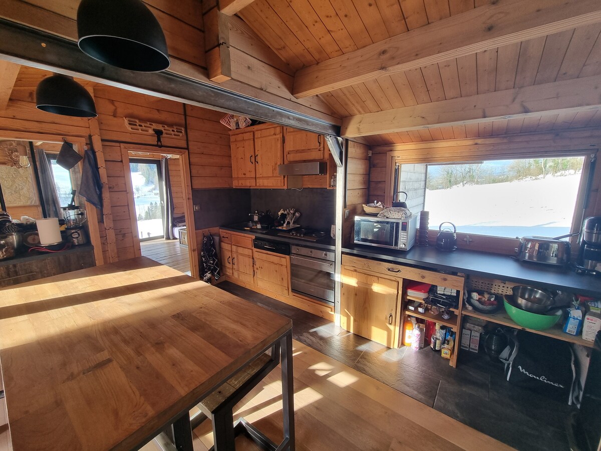 Tithíocht fráma cluthar adhmaid, rogha ábhar agus trealamh ardchaighdeáin. Timpeallacht an - chiúin, ardán mór (27 m²) ag breathnú amach ar ghairdín glasraí orgánacha. Trealamh iomlán: Leaba ar mhéid an Rí, gach fearas ar fáil. Cith Iodálach, fearais bheaga ard - deireadh. Troscán gairdín, beárbaiciú. An Ghinéiv 15 nóiméad, 25 nóiméad, Chamonix 45 nóiméad, Yvoire agus Loch na Ginéive 30 nóiméad, Plateau des Glières 20 nóiméad gar do na hionaid sciála. Bricfeastaí athraithe. Wi - Fi. Páirceáil.