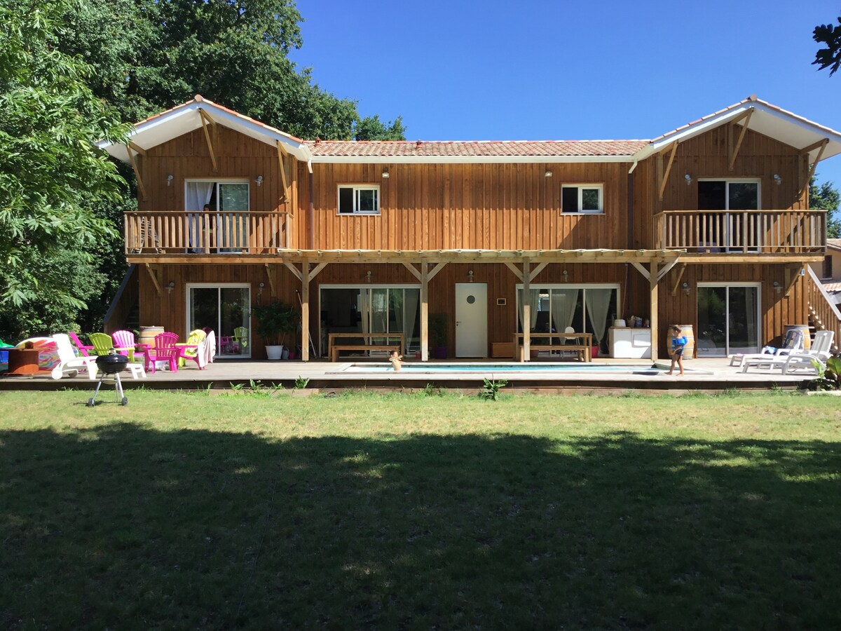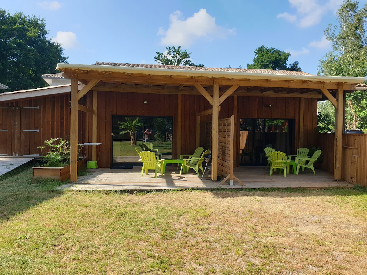 Villa álainn le déanaí in adhmad "fíor" de 150 m2. Tairgeann sé :- 3 sheomra leapa lena n - áirítear 2 sheomra le mezzanine (tocht urláir) - 2 Seomra Folctha, 2 WC. - Timpeallaithe ag 3 ardán scáthaithe - Linn snámha bheag 3mX2m le fuarú - Tolglann leabharlainne, cluichí - Ardáin lasmuigh agus ardán clúdaithe thuas staighre le tolglann lasmuigh - Páirceáil sa ghairdín - Fearais iomlána. Tá sé suite i lár Lège bourg, cúpla km ó thránna an aigéin agus ó abhantrach an Tuaiscirt.