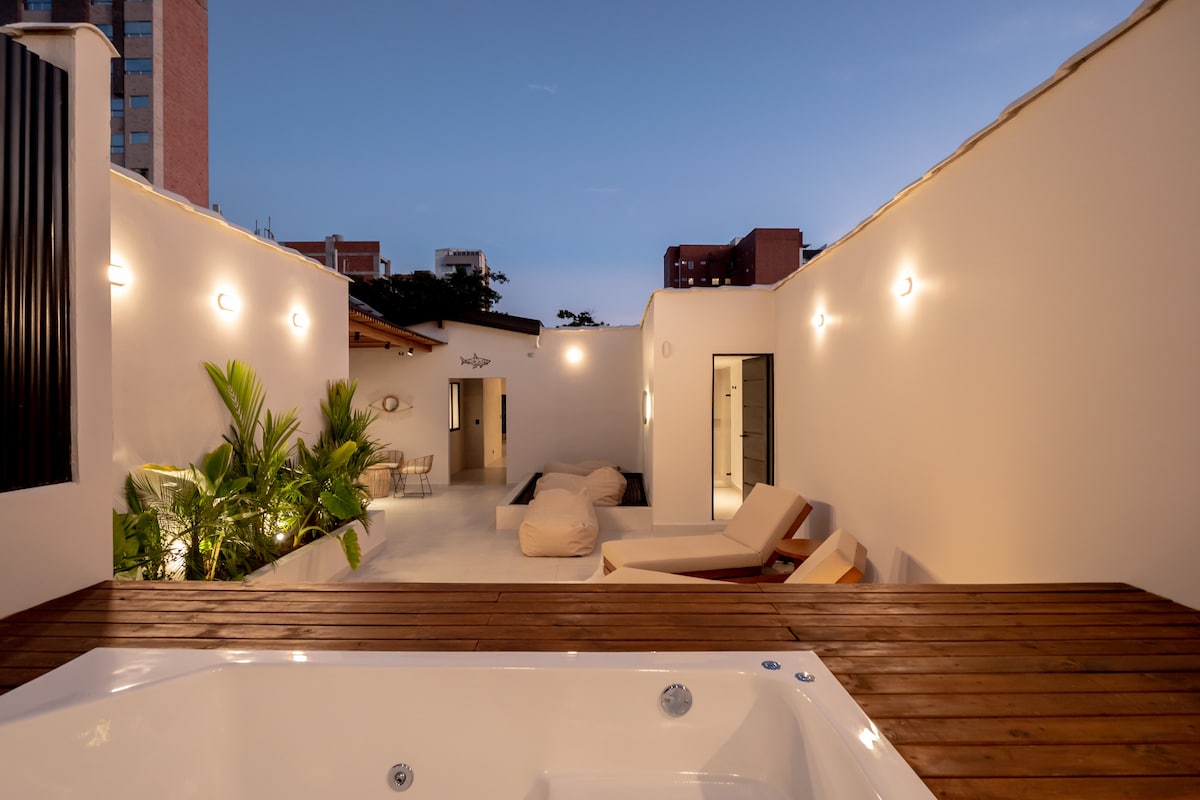 Bíodh do thaitneamh as Medellín ón stiúideo eisiach seo ina bhfuil jacuzzi príobháideach ag a bhfuil radharc ar na spéartha, leaba rí, aerchóiriú, agus radhairc iontacha ar an gcathair — an tearmann is fearr le haghaidh galántachta, compoird agus siamsaíochta oíche bríomhaire. Suite in El Poblado, céimeanna ó bhialanna, beáir dín, caiféanna agus dánlanna Provenza, agus siamsaíocht oíche Parque Lleras nóiméad ar shiúl. Bain sult as teilifís chliste 54" le Netflix, spás oibre le Wi-Fi ardluais, cistin, meaisín níocháin/triomadóir, ionad aclaíochta, sabhna, linn snámha, agus beáir, bialanna agus gailearaí ar an láthair.
