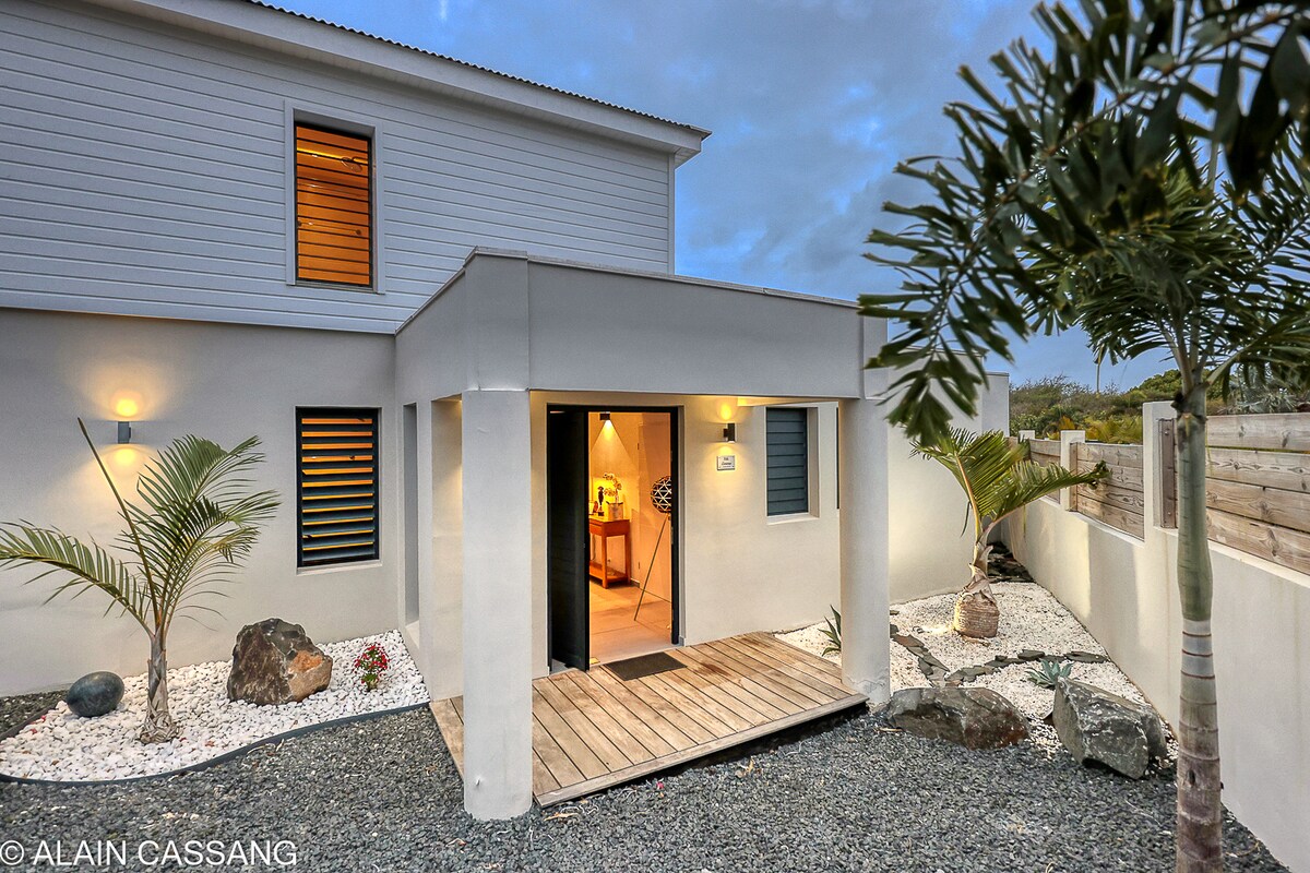 In Saint - François faigh amach faoi dhraíocht bharántúil ár n - árasáin LE ZENGA, áit a bhfuil compord ag teacht le galántacht! > 5 nóiméad ó thránna agus ó shaoráidí lár na cathrach > Teach cónaithe só pearsanta slán, linn snámha phríobháideach, gairdín trópaiceach, spás páirceála > 3 sheomra déphléacsacha 1ú hurlár, 2 sheomra leapa aerchóirithe le 2 sheomra folctha le cithfholcadán, umar maoláin > Ardán BALCÓIN le radharc gairdín, áit itheacháin agus tolglann lasmuigh > Cistin fheistithe le pas a fháil tríd > Limistéar oifige > Idirlíon Snáithín, Teilifís Chliste