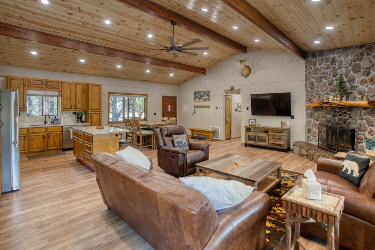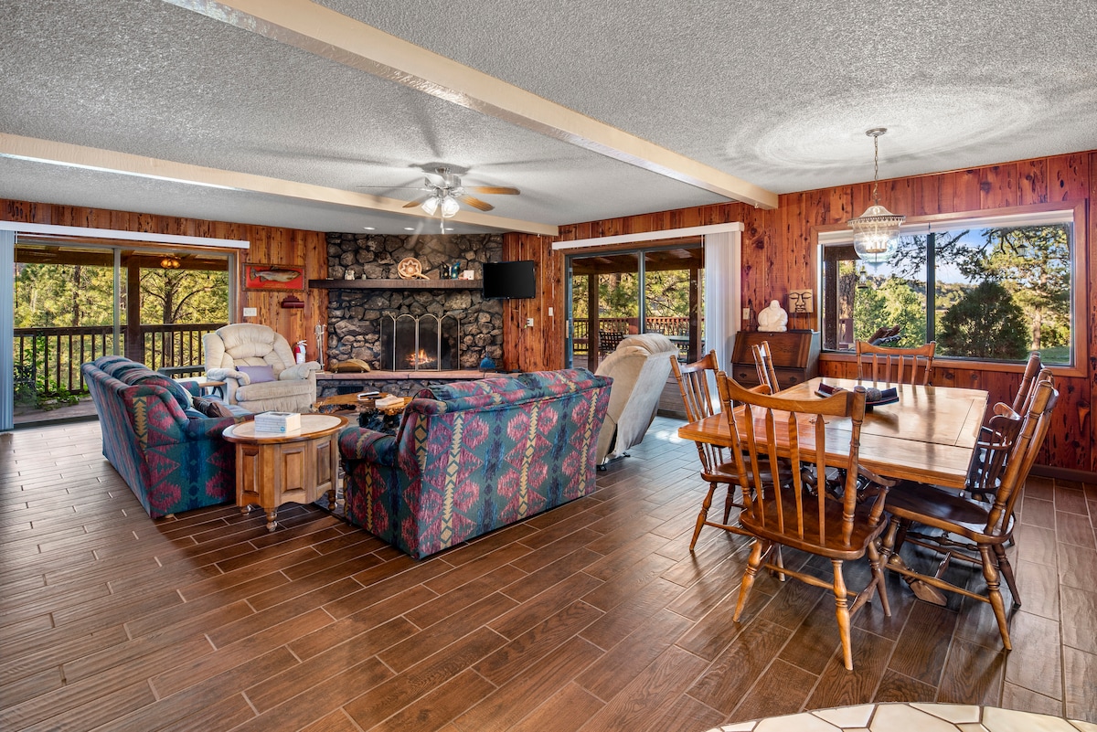 2 stáisiún deisce iontacha - 1 thíos staighre le deasc agus 1 deasc sa lochta , atá feistithe le 22" monatóir, cáblaí HDMI agus neart plocóidí. 1 BR thíos staighre le Leaba Rí teolaí agus rochtain ar fholcadán iomlán, lochta 500 troigh cearnach le 2 leaba bhanríona, leaba lae, pacáiste agus súgradh, 2 theilifís agus 1/2 seomra folctha. Sé Pines Lodge Hexagon Fíor Log Cabin! Fálaithe go hiomlán agus Oiriúnach do pheataí! Níl le déanamh ach do earraí níocháin a thabhairt leat agus bain sult as na Sléibhte Bána áille in Arizona!