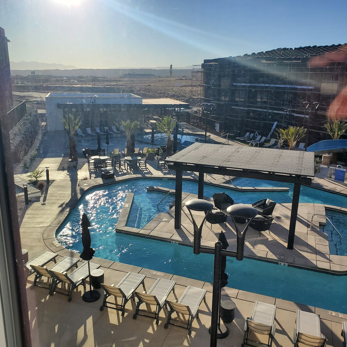 Árasán fairsing sundance ag breathnú amach ar an linn snámha.