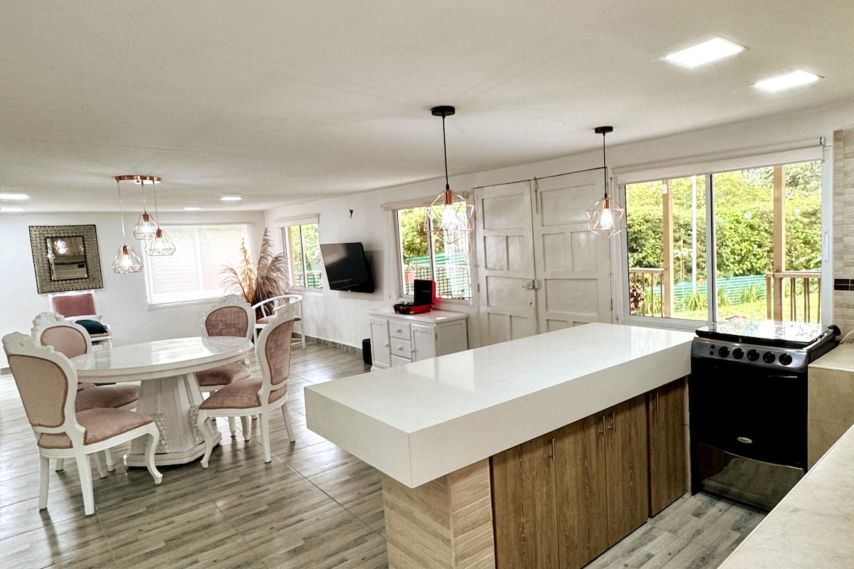 Éalú go teach tuaithe atá timpeallaithe ag an dúlra agus ag an gciúin, nach bhfuil ach 5 nóiméad ó phríomhpháirc Filandia. Bain sult as oícheanta tine champa, tírdhreacha caife agus spásanna fairsinge le roinnt le do theaghlach nó le do chairde. Tearmann dearthóir i lár thírdhreach caife na Colóime. Faigh suaimhneas agus an dúlra sa bhfoirm is íone. Bain sult as leathanradharc ar fhoraois agus ar ghleannta Quindío. Éirí na gréine dodhearmadta, spéartha réaltaí, agus solas na gréine draíochta
