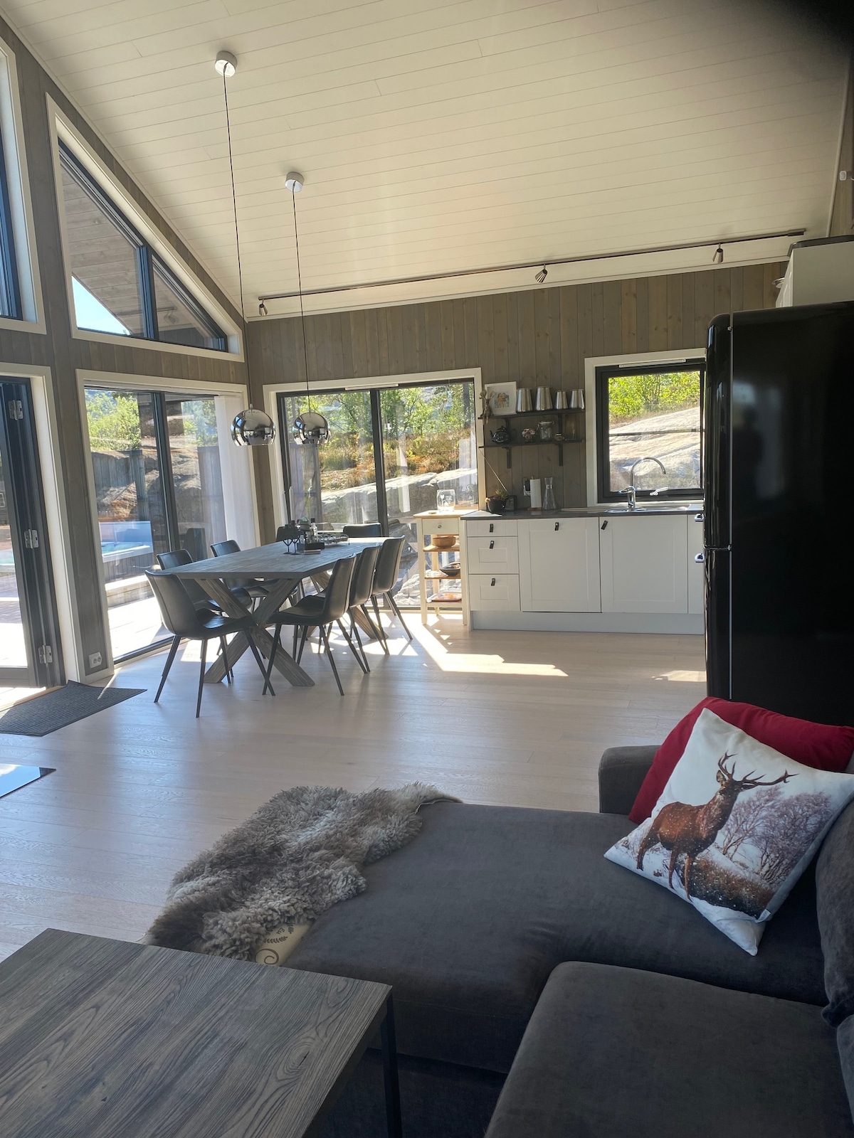 Moderne hytte fra 2021 med vinduer fra gulv til tak som åpner hytten mot en spektakulær utsikt over fjell og dal. På sommeren beiter sauene rundt hytten og er du heldig kommer det en hare hoppende. På vinteren er det ski inn/ut. Hytten har både varmepumpe og peis som gir god varme og kos. Den romslige loftstuen med TV, Lego og spill er perfekt for barna. Hytten passer perfekt for to familier. Er dere bare voksne anbefales maks 8 personer.