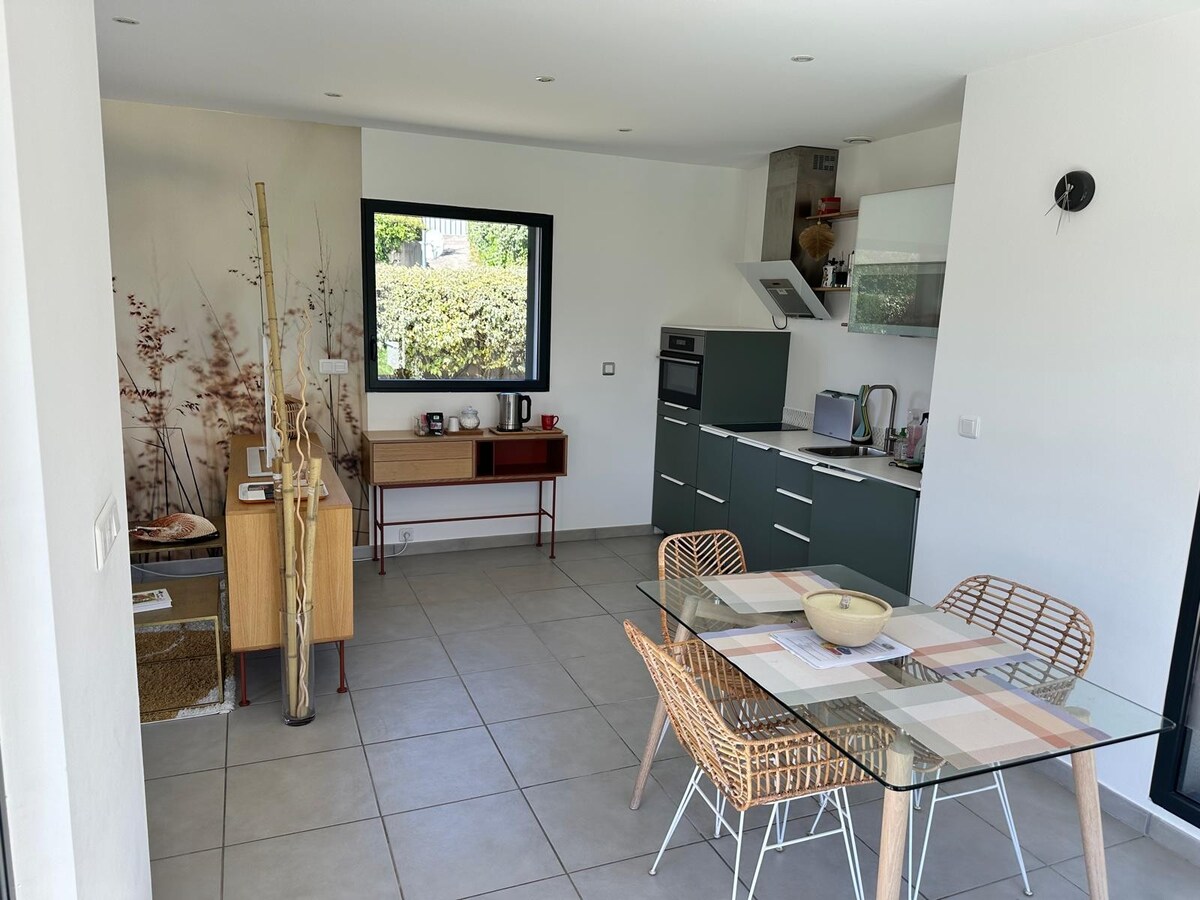 Fáilte go dtí ár ósais phríobháideach do 1 duine nó 2 dhuine i gcroílár na béasa! Bain sult as an linn snámha uisce sáile téite atá timpeallaithe ag plandaí trópaiceacha. Cuirfidh an spás tearmann scátha agus suaimhnis ar fáil duit. Bíodh bricfeasta agat, aperitif, nó cócaráil cois linne sa chistin phaitió lasmuigh. Tá cóiriú aeir ar an seomra leapa agus tá éadaí leapa agus línéadach orgánacha ar ardchaighdeán óstáin ann, lena chinntiú go bhfuil d'fhanacht ar do shuaimhneas agus speisialta.