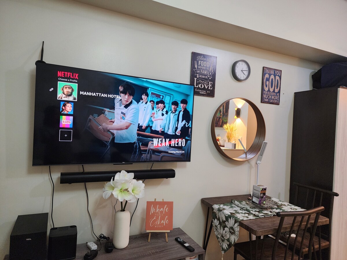 Bain sult as an Aonad Álainn seo atá lonnaithe i gCathair Araneta, áit a bhfuil gach rud laistigh de Reach. Nuair a rachaidh tú isteach san aonad cuirfear fáilte romhat le cistin ina bhfuil Earraí Cócaireachta agus Uirlisí iomlána. Chomh maith leis sin tá Línéadach iomlán ag an bhFolcadán le huisce te agus fuar agus bidet. Lig do scíth agus bain sult as do Chodladh le Leaba ar mhéid na Banríona le Tocht Ardchaighdeáin agus Piliúir Bhoga agus Aircon Sárfhuar. Bí ag faire i dTeilifís Chliste 43”úrnua le cuntas Premium Netflix agus féach i Réiteach 4K. Idirlíon Ardluais 100MBPS
