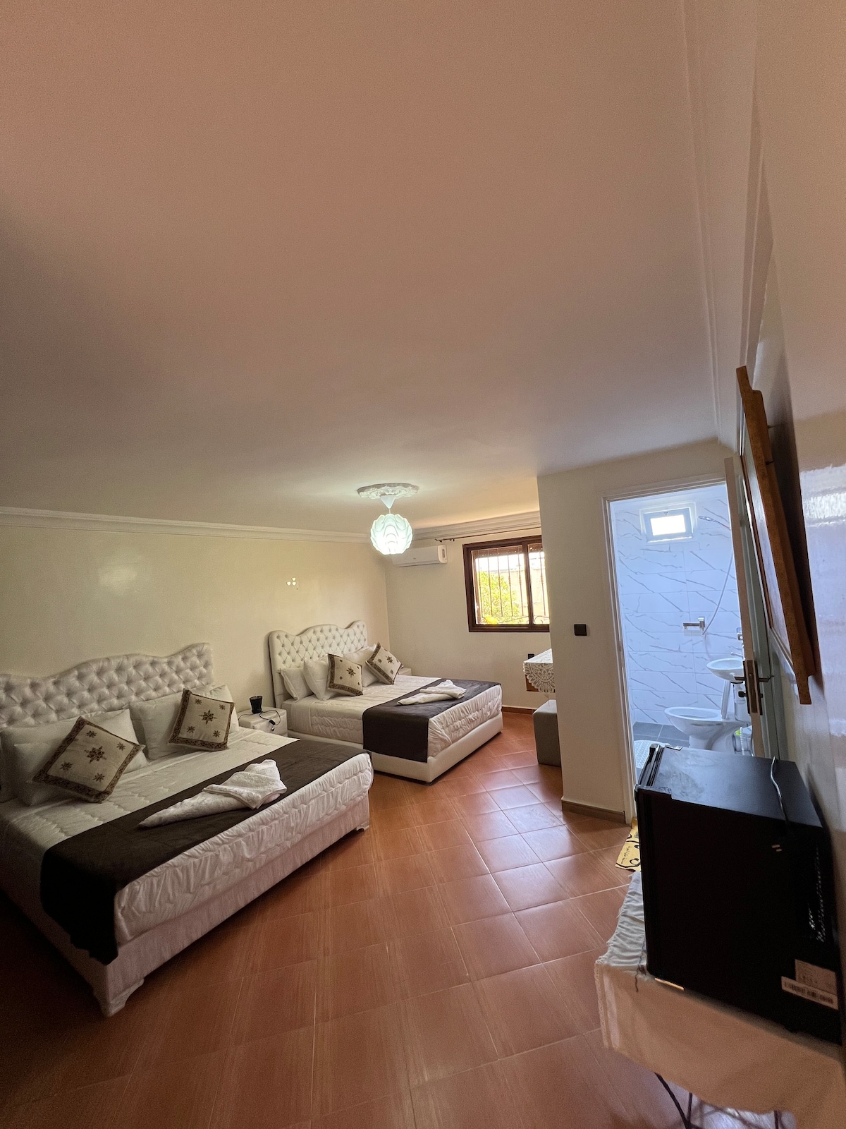 Magnifique maison-ferme à louer Située à 35 km d’El Jadida, 40 km d’Oualidia et 130 km de Marrakech. Profitez d’une grande villa équipée avec piscine privée, jardin arboré, arbres fruitiers et poules. Un lieu paisible, idéal pour familles ou groupes en quête de nature. Service sur demande : tajines, couscous et spécialités marocaines maison