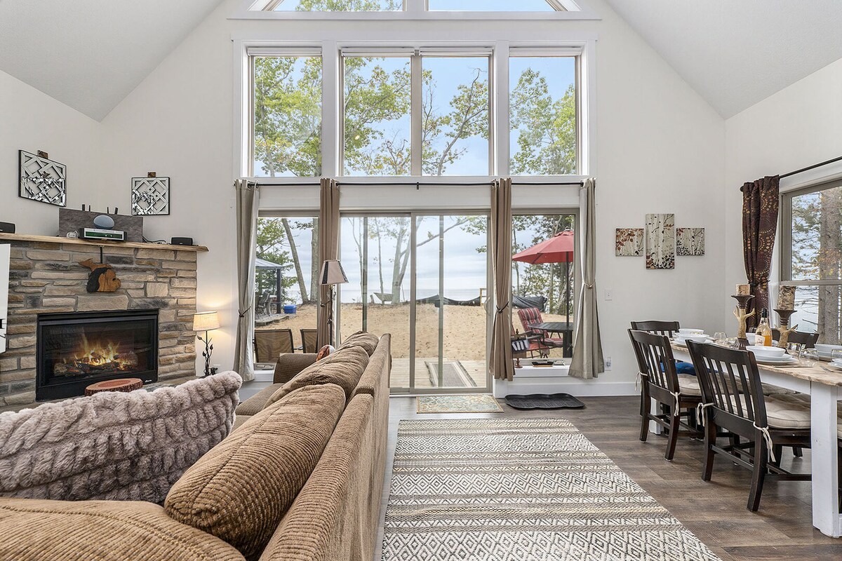 TEACH AR IMEALL UISCE LOCH MICHIGAN AG POINTE INSPIORÁIDE, ARCADIA, MI. Imeall an uisce, grianáin áille & gaothrán locha atá neadaithe faoi Phointe Inspioráide i gcroílár Caomhnaigh Dúlra Arcadia Dunes. Teallach cloiche as cuimse, seomra suí oscailte & cistin le radhairc iontacha, deic, roghanna iontacha gréine. Bonn álainn chun taitneamh a bhaint as go leor nithe is díol spéise sa cheantar. Grúdlanna ceardaíochta, drioglanna, fíonlanna, galf den scoth, sciáil, bádóireacht, cearrbhachas & bia in aice láimhe.