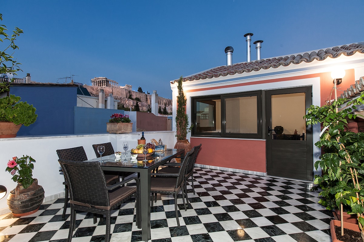 Tá an teach suite go litriúil faoi scáth an Acropolis agus díreach faoi bhun na Carraige Naofa. Tá Anafiotika ar cheann de na comharsanachtaí is sine in Aithin agus tá an dath agus an carachtar a bhí aige san am atá thart fós aige. Is ceantar cónaithe amháin é. Ar an díon, tá deis ag duine ar bith a shuíonn ann Aithin a fheiceáil ón bpointe is airde agus fuinneamh dearfach na háite a mhothú, áit a roghnaigh na Gréagaigh ársa, agus ní go teagmhasach, chun ceann de na seacht n-iontas den domhan a thógáil!