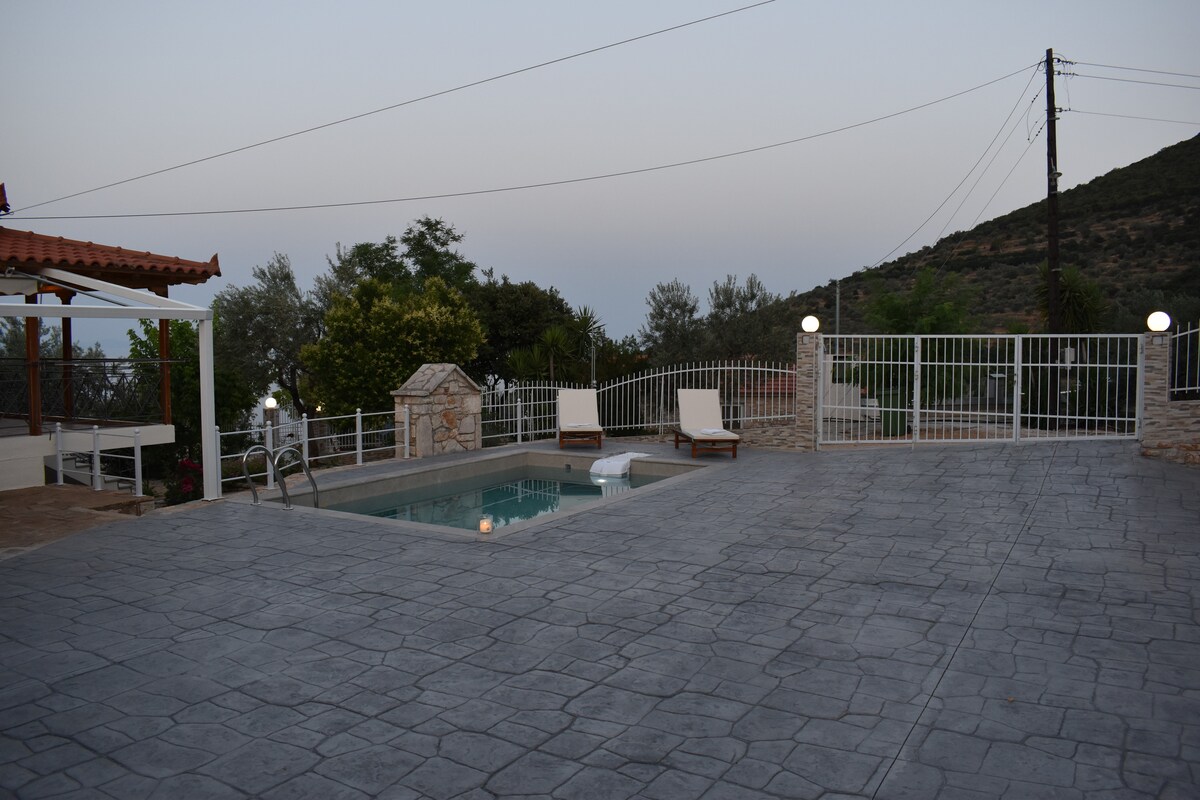 Teach cloiche atá athchóirithe go hiomlán agus a tógadh le hábhair nádúrtha adhmaid agus cloiche, gnéithe maisiúla bunaidh agus troscán uathúil chomh maith le seomra folctha agus cistin dearaidh nua - aimseartha. Tá sé suite níos lú ná leath uair an chloig ar shiúl ó Amharclann Ársa Ársa, a bhfuil cáil air ar fud an domhain, gar do go leor tránna éagsúla, bailte stairiúla agus rómánsúla cois farraige Nafplio nó Palaia Epidavros agus go leor radharcanna eile! Wi - Fi, teilifís, 2 aonad aerchóirithe, meaisín níocháin ar fáil!