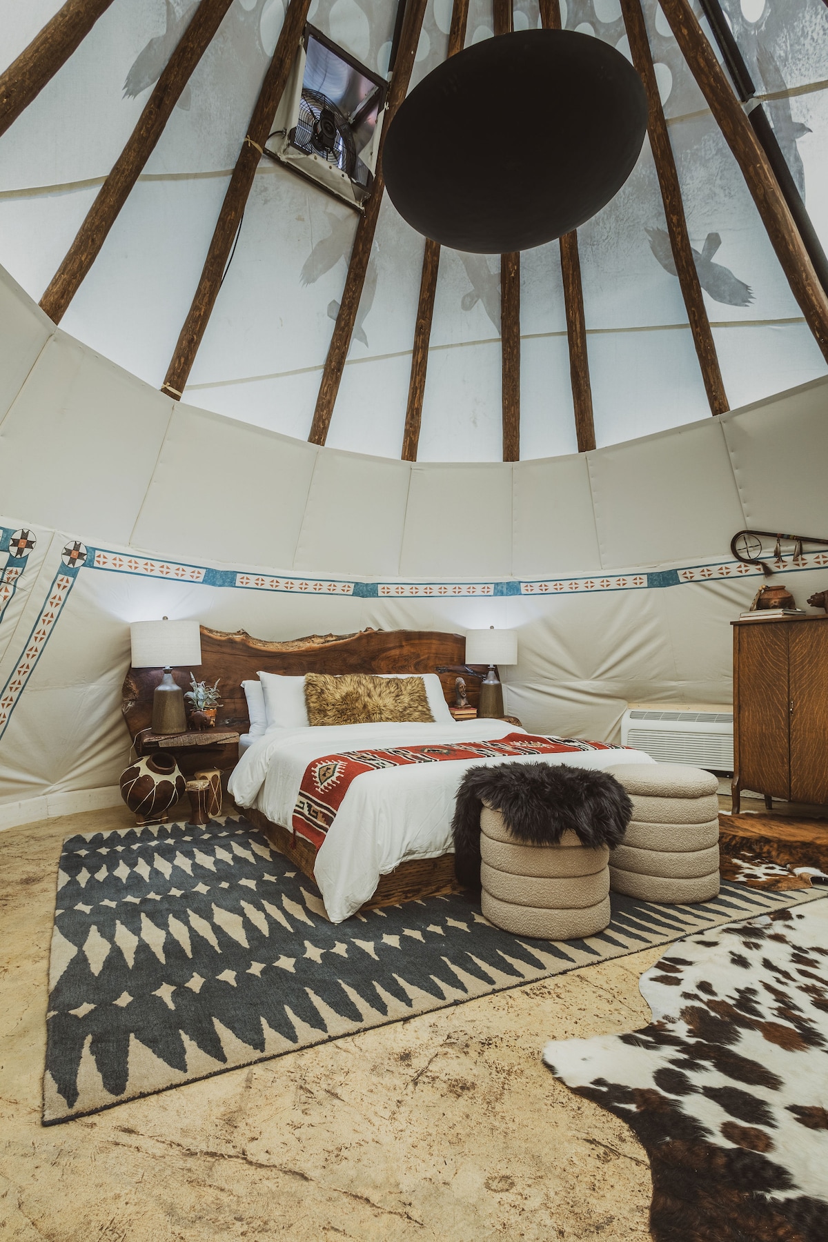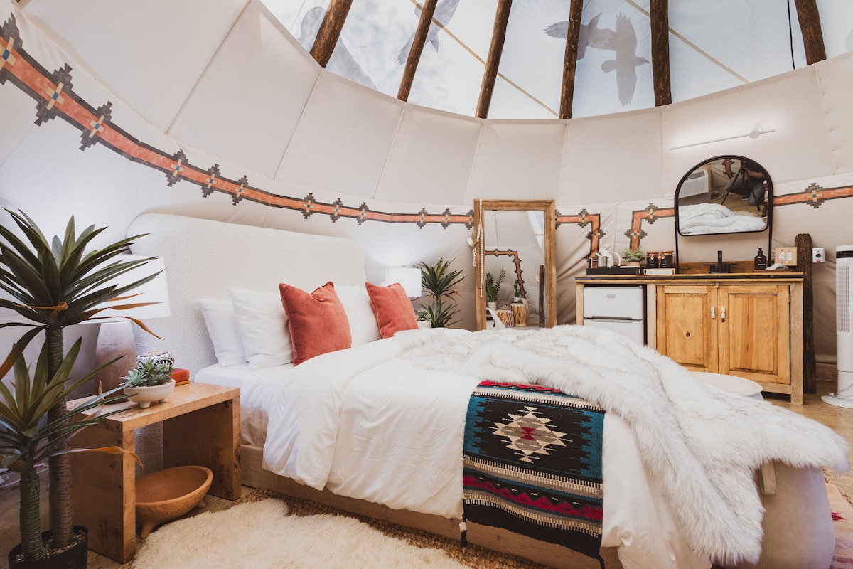 Faigh blaiseadh de shaoire ghearr rómánsúil inár Tipi sómasach, ar stíl fhánach, atá suite i gcroílár an dúlra. Agus é spreagtha ag tipis thraidisiúnta na dtreibheanna fánacha, cuireann an tearmann glampála seo galántacht thuathúil ar fáil le saoráidí nua - aimseartha. Bain sult as taobh istigh teolaí le haerchóiriú, seomra scíthe iomlán, agus rochtain ar ghríoscáin chomhchoiteanna agus ar pholl dóiteáin. Agus tú ag tabhairt ómóis dár ndeartháireacha agus dár ndeirfiúracha Meiriceánacha Dúchasacha, tugann an t - éalú suaimhneach seo cuireadh duit díphlugáil, scíth a ligean, agus cuimhní cinn dodhearmadta a chruthú ag El Mistico Ranch's...La Tribu