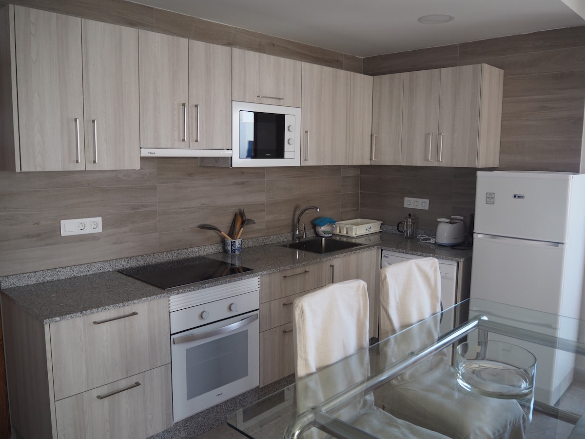 Árasán nua in Puerto del Carmen, atá suite i gcoimpléasc an - chiúin agus linn snámha chomhchoiteann ag breathnú amach ar an bhfarraige. Is é an chuid is fearr den árasán seo ná a ardán, tá leaba chruinn ann le haghaidh luí na gréine, gríoscán lasmuigh le haghaidh cócaireachta agus bord mór le hithe nó le hoibriú le radhairc ar an aigéan. Taobh istigh de tá seomra suí ina bhfuil teilifíseán cliste idirnáisiúnta, tolg an - chompordach agus tábla beag bricfeasta. Tá an chistin lánfheistithe: oigheann, micreathonnán, cuisneoir, pannaí agus earraí cistine.