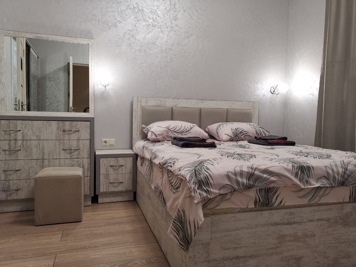 Современная и уютная двухкомнатная квартира на первом этаже. Просторная спальня с удобной кроватью, светлая гостиная с диваном и рабочей зоной, полностью оборудованная кухня, где можно готовить. В квартире есть Wi-Fi, кондиционер, чистое бельё, полотенца и всё необходимое для комфортного проживания. Жильё подойдёт семьям, парам и гостям, которые ценят тишину и удобство.