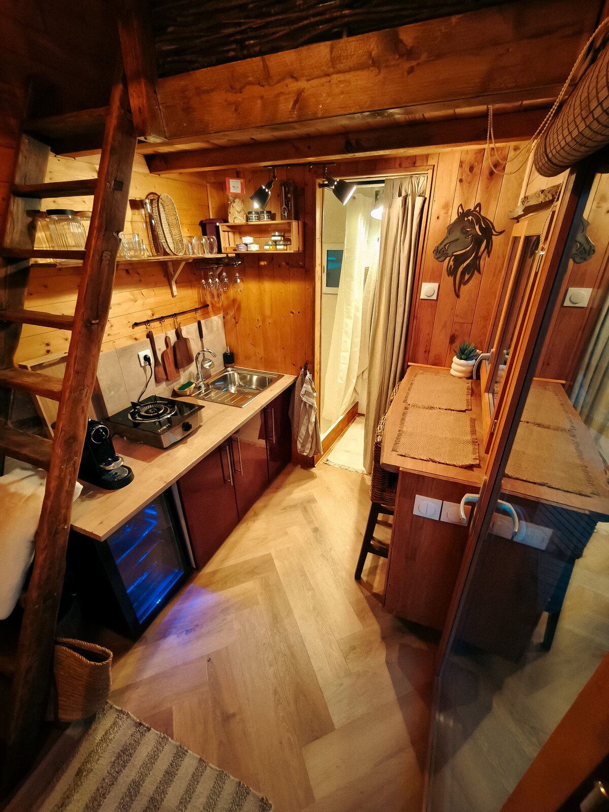 Teachín beag nua le maisiú fásra 26 méadar cearnach feistithe go hiomlán gan a mhalairt. Do 4 dhuine agus leanbh. * 1 leaba dhúbailte (140cm /200cm) * 1 leaba thoilg 2 dhuine (140cm/200cm an - chompordach) * 2 chliabhán linbh ar fáil ar iarratas gan aon táille bhreise * Gairdín línithe crainn agus 2 ardán ciúin, a bhfuil ceann acu clúdaithe ( pergola)