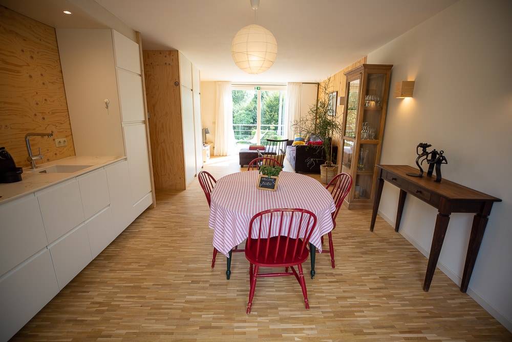 Níl le déanamh ach sos a ghlacadh ag an áit shuaimhneach seo le fanacht. Sa teach adhmaid seo, atá deartha ag an ailtire/ealaíontóir Wim Cuyvers agus atá suite faoin tuath, tá árasán fairsing curtha ar fáil mar theach aíochta ar an gcéad urlár. Tá sé suite go lárnach idir cathracha cultúrtha Brugge, Gent, Antwerpen agus Brussel. A reáchtáil fíor rothar agus parthas fánaíochta. Tá an suíomh seo oiriúnach do thaistealaithe gnó freisin, tá crios gnó sa réigiún.
