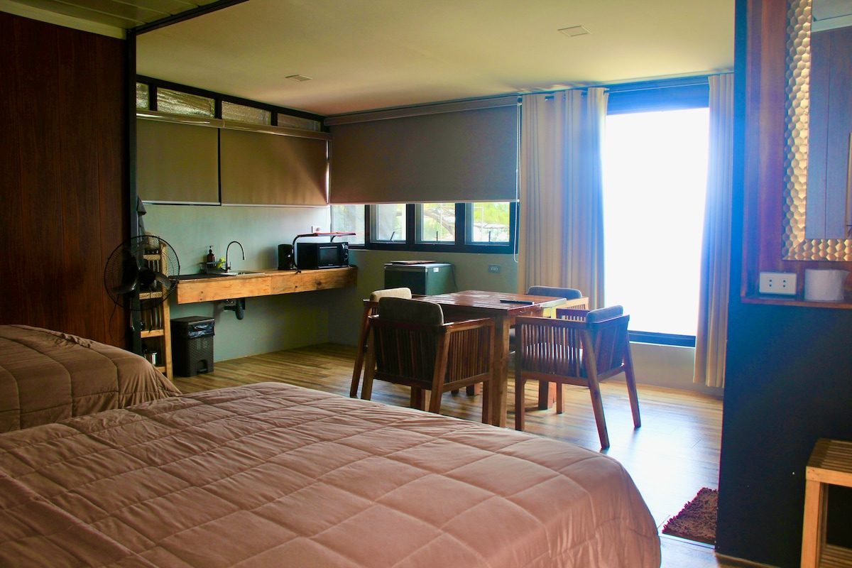 Éalaigh go dtí ár dTithe A - Frame le radhairc iontacha. Suite ar chnoc, cuireann gach ceann dár dtithe meascán teolaí de mhaireachtáil nua - aimseartha ar fáil agus radhairc lánléargais á ndúiseacht acu. Tá a leithreas & seomra folctha féin ag gach aonad. Tá an deic phríobháideach foirfe le haghaidh caife nó stargazing. Tá ár bhforbairt suite in aice leis an gcathair, geallann ár bhforbairt tearmann uathúil, suaimhneach agus áisiúil. An - oiriúnach do shaoirí gearra rómánsúla nó d'eachtraí teaghlaigh, cuir d'fhanacht in áirithe le haghaidh fanacht uathúil baguio go luath! Táimid ag tnúth le tú a óstáil.