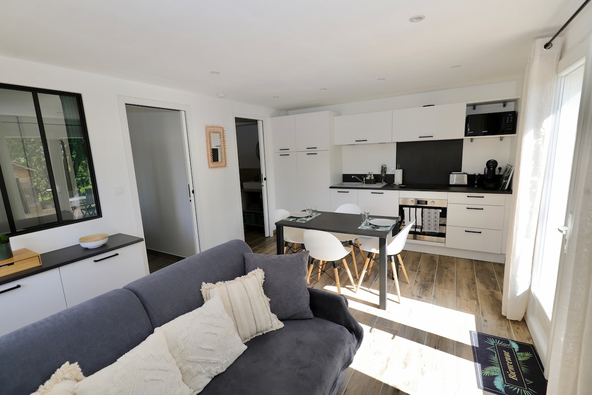 Rangaigh T2 3 réalta, neamhspleách ar bhunurlár ár dtí. Ardán agus páirceáil phríobháideach in aice láimhe, cistin feistithe, 1 gde chbre agus is féidir leaba bhreise a fháil do leanbh. Éasca le rochtain a fháil ar an gcomharsanacht, siúlóid 10 nóiméad ó C.V. agus ó lár stairiúil Aubenas, baile geata PNR an Monts d'Ardèche; 30 nóiméad ó Vallon Pont d'Arc agus gar d'áiteanna snámha sa samhradh, siúlóidí agus spóirt eile lasmuigh. 10 nóiméad ó Vals - les - Bains d'aíonna Spa. Cuirtear línéadach leapa agus tuáillí ar fáil.