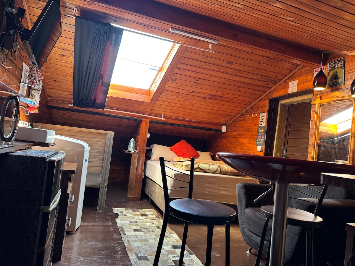 Má tá tú ag lorg cúinne uathúil, fáilteach agus lán de dhraíocht, tá tú díreach tar éis é a aimsiú! Is fíor - shaoire é an t - áiléar 35m² seo ag barr an tí — spás dlúth feidhmiúil atá clúdaithe go hiomlán in adhmad, a léiríonn compord agus teas i ngach mionsonra. Le fuinneog ar an díon a ligeann do sholas nádúrtha dul isteach go réidh, tá an timpeallacht foirfe chun do scíth a ligean nó chun oibriú le suaimhneas intinne. Tá an maisiúchán íostach agus fáilteach, oiriúnach do lánúineacha agus do thaistealaithe aonair agus do mhálaí droma araon.