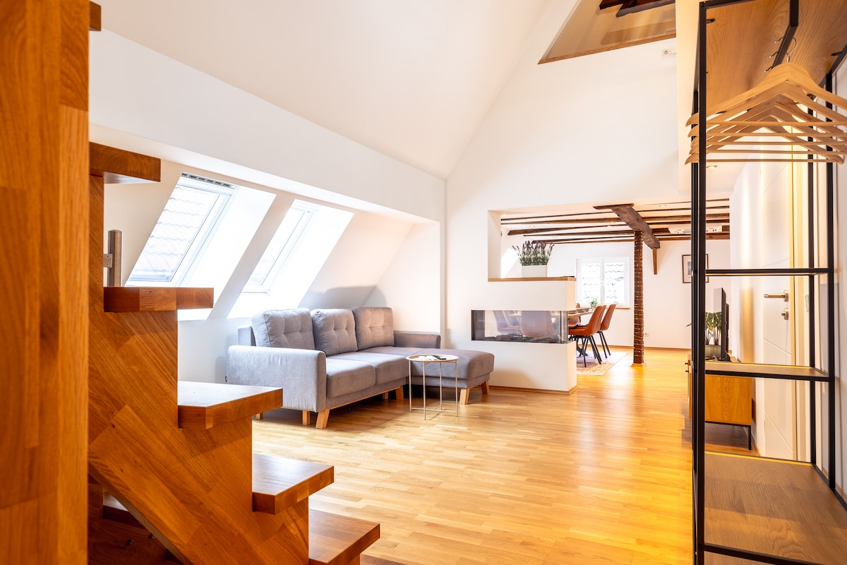 Áit speisialta le fanacht a bhfuil carachtar lochta aici. Lochta a dearadh le grá mór do mhionsonraí, ina bhfuil leaba dhúbailte agus tolg leapa do 3-4 duine. Seomra folctha fairsing ina bhfuil tobán folctha/cithfholcadán. Spás oscailte le cistin féinfhreastail. Spás príobháideach lasmuigh le bord agus tolg gairdín. In ainneoin gur réadmhaoin chomhroinnte é le teach stairiúil, tá neamhspleáchas agus príobháideacht iomlán ann. Tearmann foirfe ar imeall na foraoise do dhaoine a bhfuil dúil acu sa dúlra. 8 nóiméad go Loch Baldeney. Iompar poiblí (5 nóiméad go dtí an bus/14 nóiméad go dtí an S-Bahn)