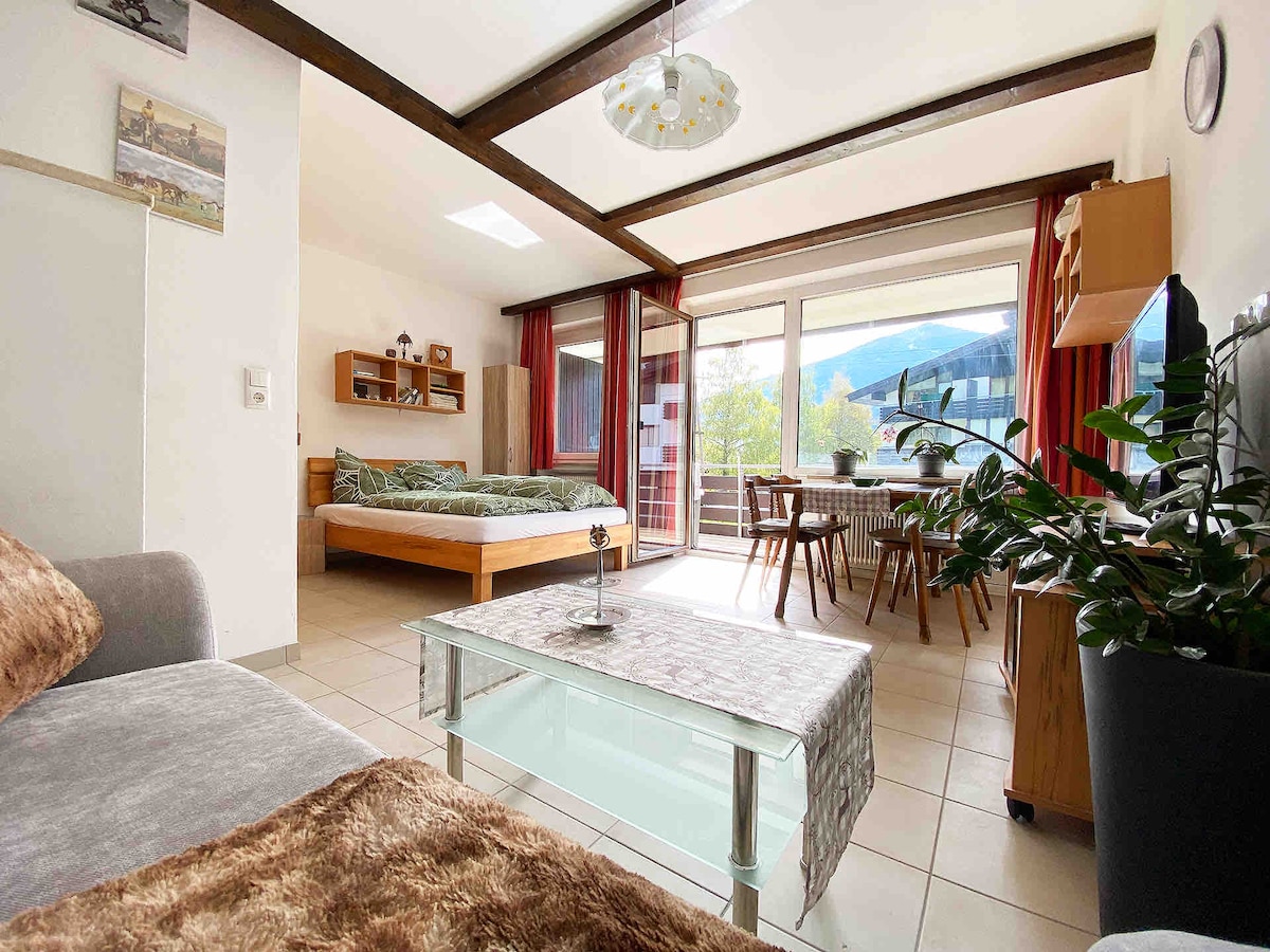 Sa sabhna le lánléargas iontach sléibhe, is féidir leat do scíth a ligean agus taitneamh a bhaint as na radhairc iontacha ar an mbalcóin mhór ar throscán fuarlaigh. San árasán 2 sheomra, gheobhaidh tú é go léir le haghaidh saoire fhoirfe. Biachlár blasta i gcistin ardchaighdeáin Miele agus bain sult as braon maith fíona os comhair an teallaigh. Is féidir leat oíche mhaith chodlata a fháil sa leaba dhúbailte fíor - adhmaid le tochtanna ardchaighdeáin. Má tá áit chiúin á lorg agat, is é seo an áit le fanacht!