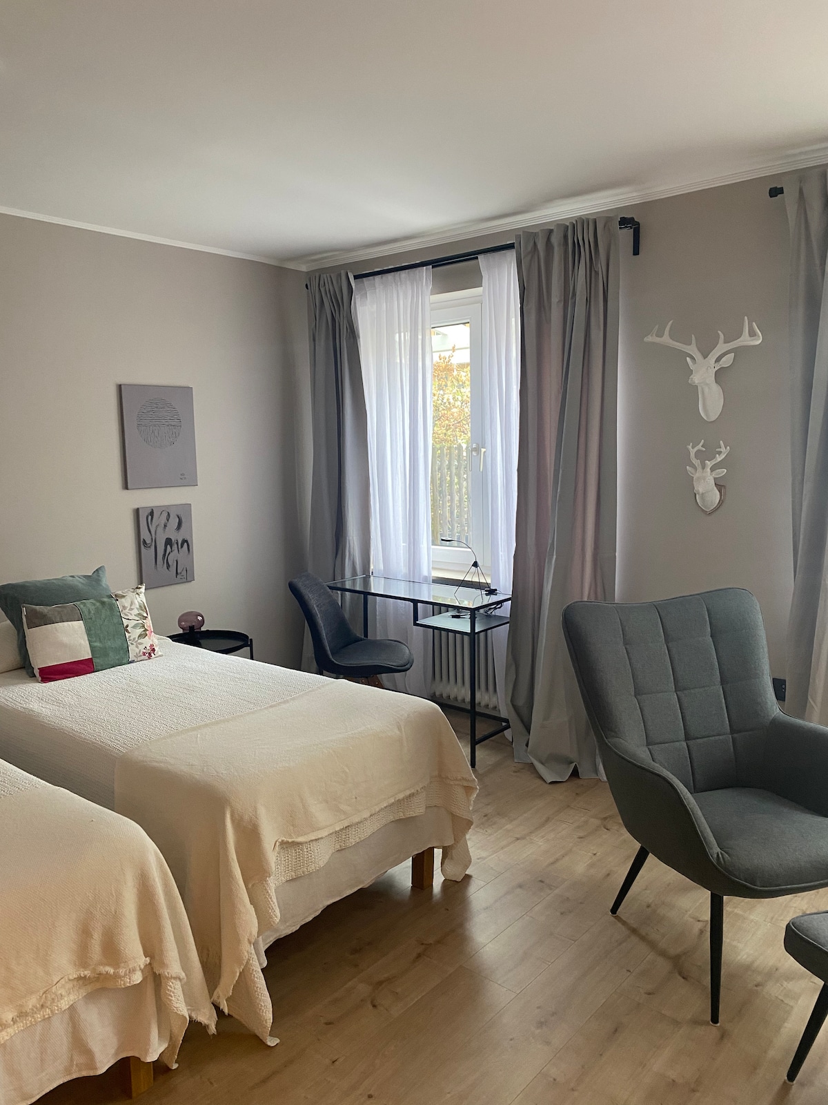 Gemütlichen und stilvollen Unterkunft. Eine kleine einladende Küche mit Sitzgelegenheiten wird von 2 gemütlichen Zimmern eingerahmt. Dazu ein Bad m. Badewanne & Dusche. Ein Balkon ist ebenfalls vorhanden. Die Betten lassen sich zusamenstellen. Die Wohnung im privaten Wohnhaus, das von den Eigentümern bewohnt wird befindet circa 20 km entfernt von Frankfurt/Main. Sie befindet sich im ersten OG. Die Großstadt ist gut zu erreichen mit Bus u. Bahn. Einkaufsmöglichkeiten sind fußläufig zu erreichen.