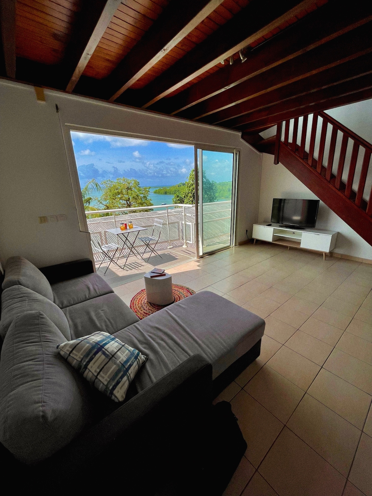 Árasán dhá urlár aerchóirithe i dteach beag deas, an-ciúin agus suite go hidéalach i lár an oileáin chun cuairt a thabhairt ar Guadalúip. tá na siopaí go léir laistigh d'achar siúil ar an oileán glas seo a bhfuil radharcra farraige aige: bácús, siopa grósaera, preas tobac, cógaslann srl. Bialanna agus lónadóirí bia áitiúla freisin. Sómas den scoth: is annamh a bhíonn gearradh uisce... toisc go bhfuil an áit chónaithe gar don chlinic uisce ghlain.