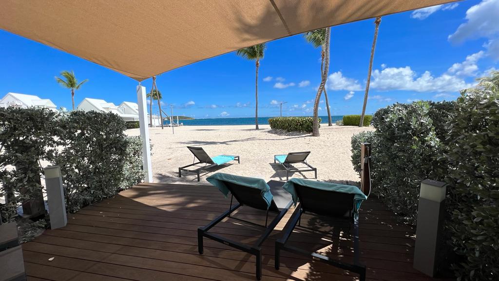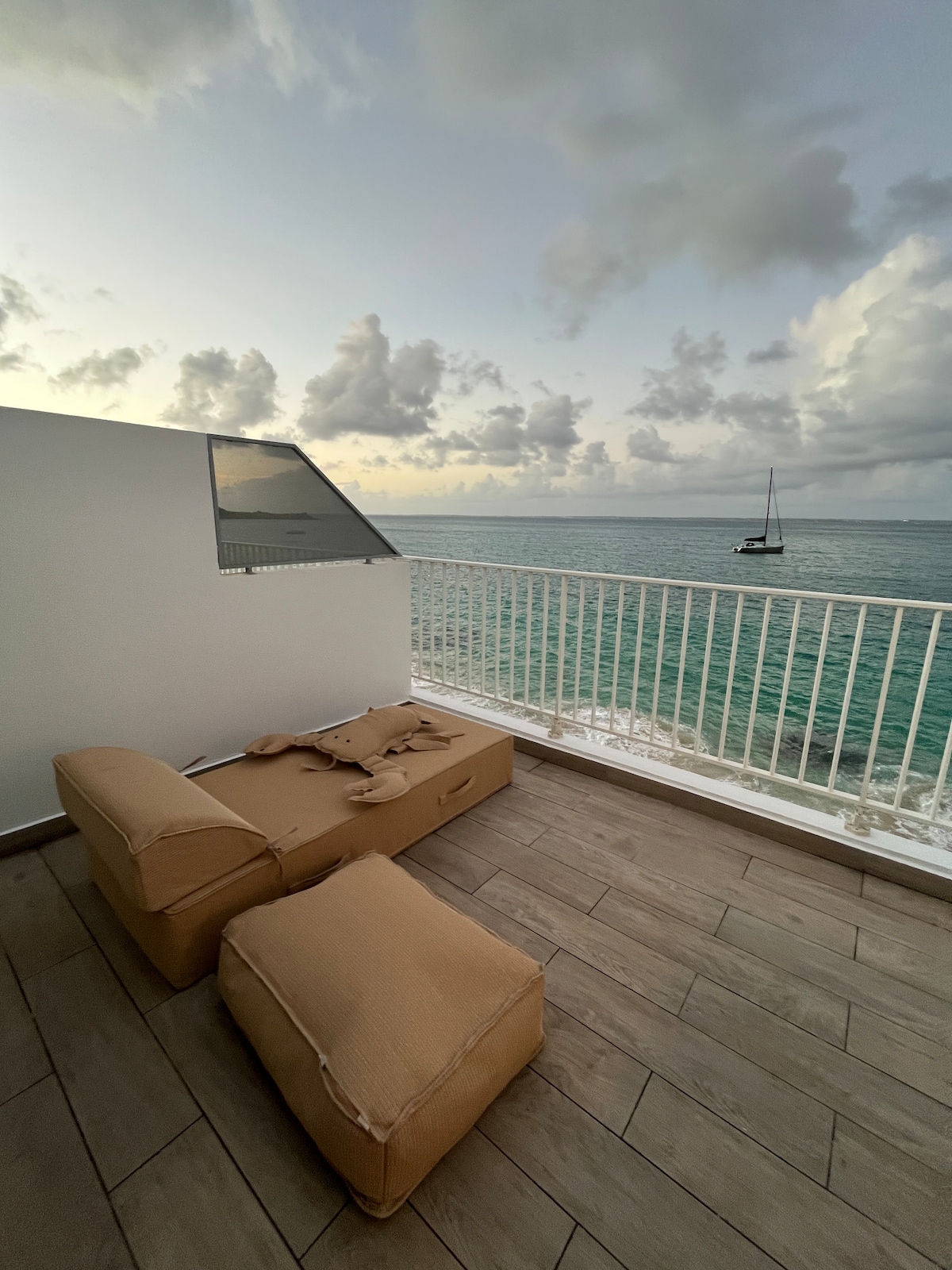 Lochta eisceachtúil ar imeall na trá ar Grand Case Beach, a thairgeann radhairc mhaorga ar an aigéan agus suíomh den scoth os cionn Rainbow Café. Sa bhardshráid, bíonn atmaisféar galánta agus faiseanta ann go dtí thart ar 11 p.m. Is féidir leapacha gréine a chur in áirithe go díreach nó trínne—ach bíonn lúcháir ar aíonna a dhéanann áirithint lenár gcabhair. Tearmann lonrach sofaisticiúil atá suite i ngar do na hionaid is fearr in Grand Case.
